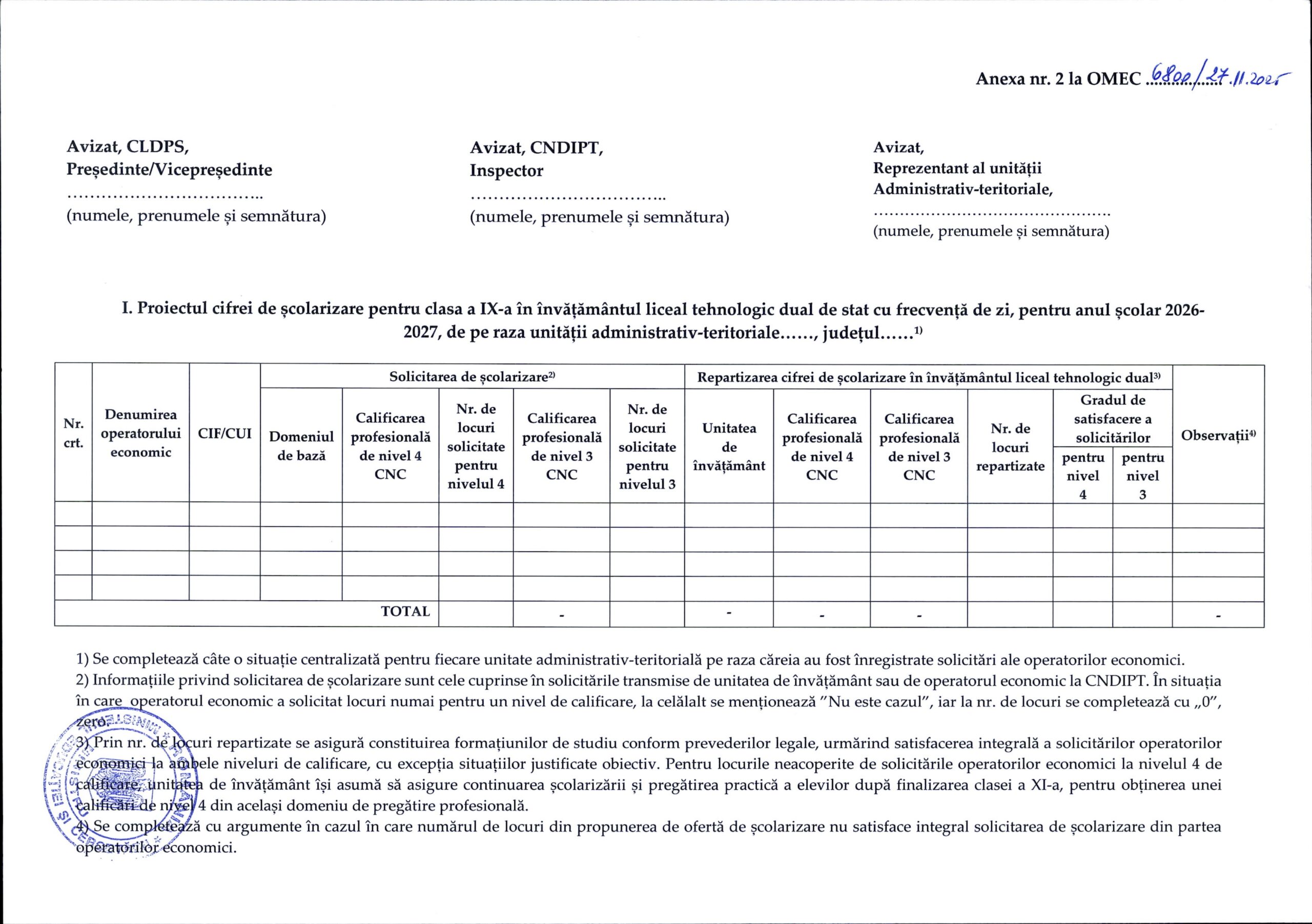 NOTĂ: În situația nerezoluționării propunerilor CNDIPT pentru creșterea gradului de satisfacere a solicitărilor operatorilor economici, ISJ/ISMB furnizează la rubrica „Observații” a anexelor nr. 2 și nr. 3 argumentele pentru care nu au fost soluționate, în raport cu precizările din art. 14 alin. (10)-(13) din Metodologia de organizare și funcționare a liceului tehnologic dual aprobată prin Ordinul ministrului educației și cercetării nr. 6700/2025.