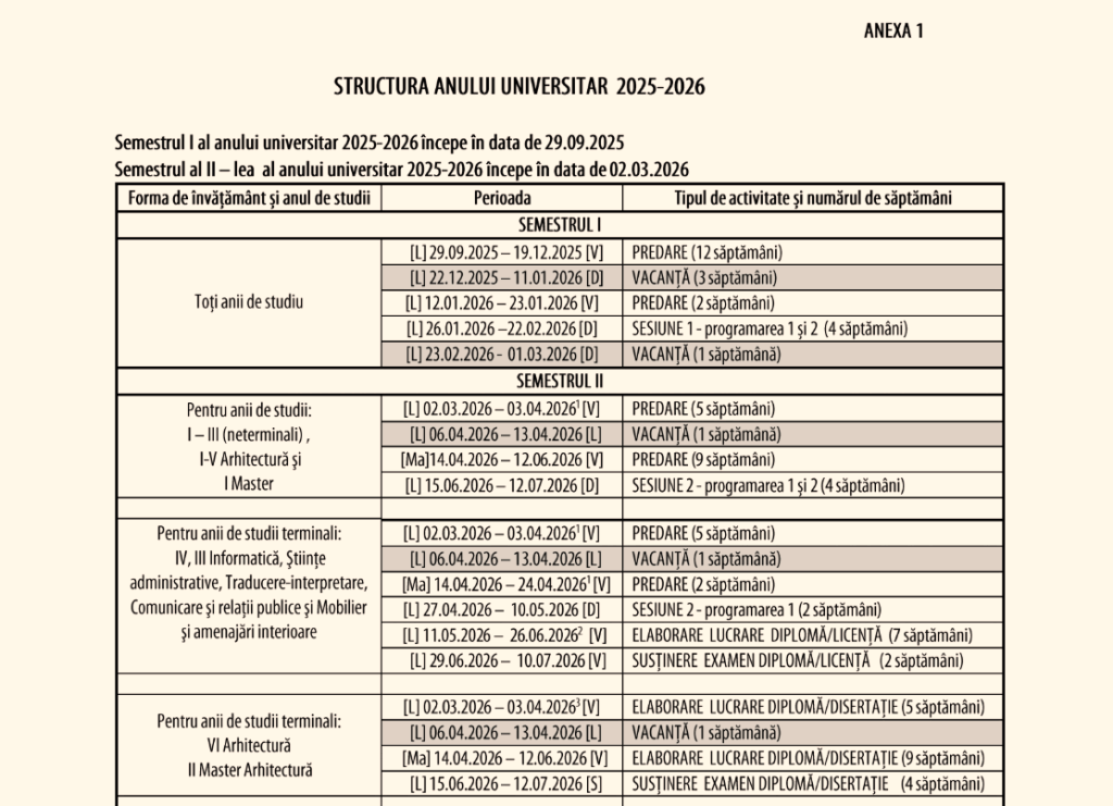 | Semestrul I | 01.10.2025 – 23.12.2025 | Activitate didactică (01.12.2025 – Ziua Națională a României – zi liberă) |