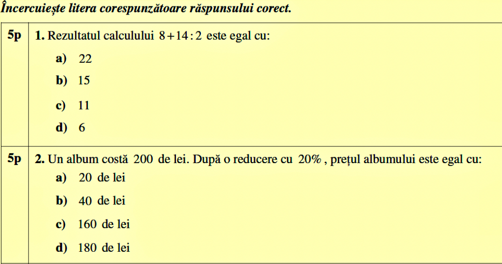 La subiectul I, exercițiul 1, elevii aveau de făcut următorul calcul și de ales o variantă de răspuns corectă: 8 +14 : 2. La al doilea exercițiu, elevii trebuia să știe să calculeze 20% din 200 și apoi să scadă rezultatul din 200. „Ambele exerciții conțin cunoștințe predate în clasele primare“, spune profesorul Flavian Georgescu.