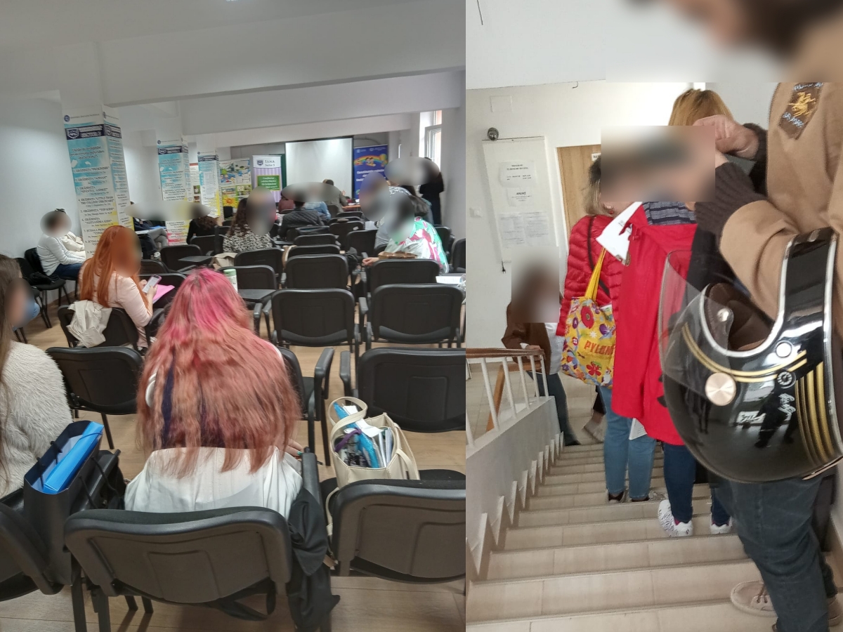 În imagini se observă cum candidații își așteaptă rândul în picioare pe hol, pentru înscrierea la concurs.