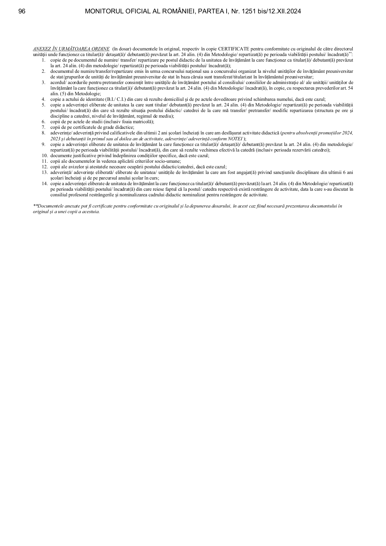 15. adeverinţa eliberată de unitatea la care sunt titular/ debutant(ă) prevăzut la art. 24 alin. (4) din Metodologie/ repartizat(ă) pe perioada viabilității postului din care să rezulte situaţia postului didactic/ catedrei pe care sunt titular/ angajat (structura pe ore şi discipline a catedrei, nivelul de învăţământ, regimul de mediu), în original; 16. adeverință/ adeverinţe eliberată/ eliberate de unitatea/ unitățile de învăţământ la care funcţionez ca titular(ă)/ detaşat(ă)/ debutant(ă) privind sancţiunile disciplinare din ultimii 6 ani şcolari încheiaţi şi de pe parcursul anului școlar în curs.