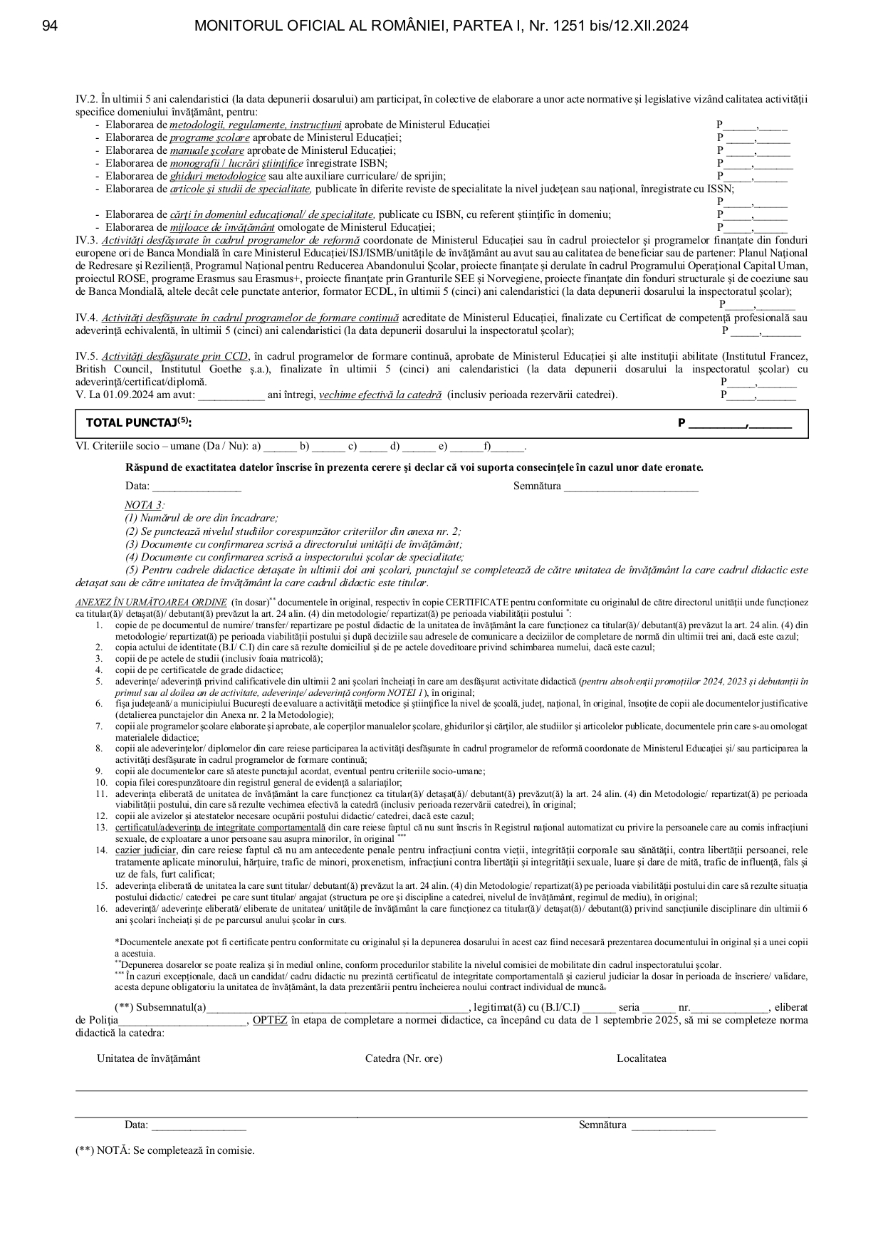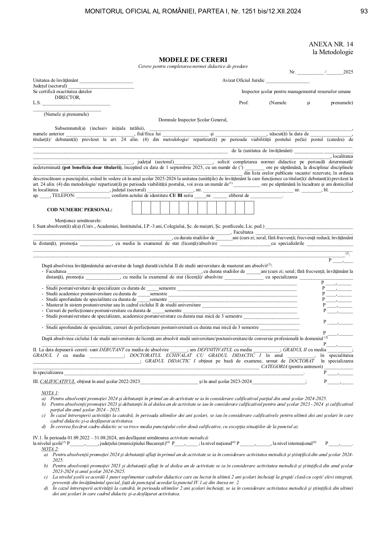 - (i) cererilor cadrelor didactice titulare pentru completarea normei didactice pe perioadă determinată/nedeterminată, respectiv a cererilor cadrelor didactice debutante prevăzute la art. 24 alin. (4) şi (6) din Metodologie pe perioadă determinată;