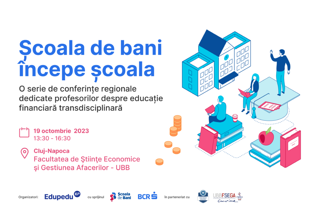 A treia conferință regională din seria „Școala de bani începe școala: resurse educaționale transdisciplinare de educație financiară“, este organizată pe 19 octombrie 2023, de la ora 13:30, la UBB – Aula FSEGA, de Edupedu.ro cu sprijinul Școala de Bani – BCR, alături de partenerul instituțional Universitatea Babeș-Bolyai – FSEGA (Facultatea de Științe Economice și Gestiunea Afacerilor). Înscrierile sunt deschise pentru participanți, prin completarea acestui formular.