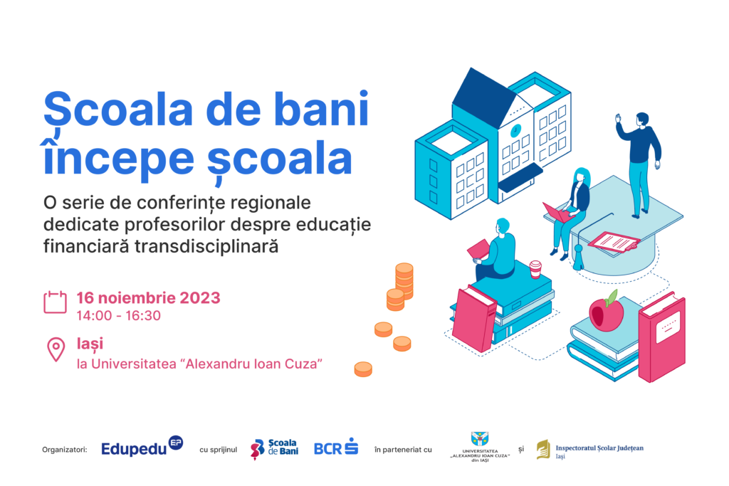 Seria de conferințe regionale din seria „Școala de bani începe școala: resurse educaționale transdisciplinare de educație financiară“, se încheie luna aceasta la Iași. Evenimentul este organizat pe 16 noiembrie 2023, de la ora 14:00, la UAIC– Aula Magna Mihai Eminescu, de Edupedu.ro cu sprijinul Școala de Bani – BCR, alături de partenerii instituționali Universitatea „Alexandru Ioan Cuza” din Iași și Inspectoratul Școlar Județean Iași. Înscrierile sunt deschise pentru participanți, prin completarea acestui formular.