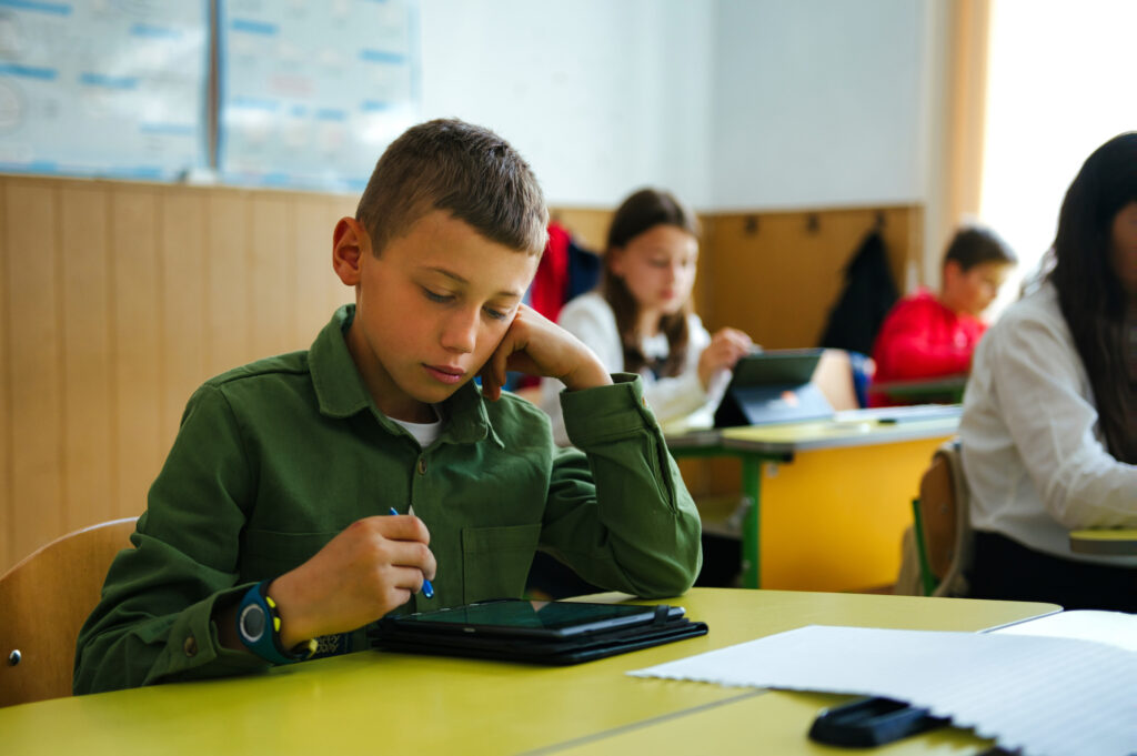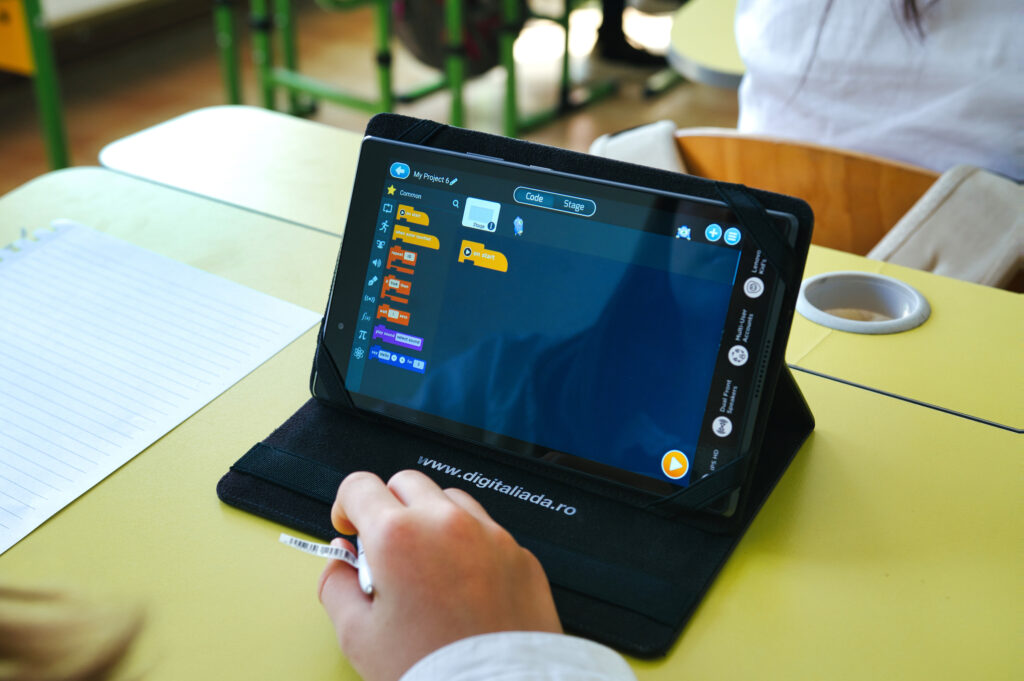 Andrea Cătinean: Pentru mine, platforma Digitaliada este totul: eu o folosesc de la începutul actului didactic, până la sfârșit. Pentru predare creez materiale informative pentru copii. Pe partea de consolidare, folosim toate aplicațiile pe care le avem pe tabletă, de la algebră la geometrie, la fiecare lecție folosesc o anumită aplicație. La geometrie de exemplu folosim GeoGebra și consolidăm mult mai bine. La evaluare, folosesc testele create de mine la fiecare unitate de învățare: undeva la 80% din oră folosesc mijloacele digitale si platforma Digitaliada în sine, școala fiind dotată și cu Chromebookuri mă ajută să îmbinăm dotarea din școală cu dotarea primită în proiectul Digitaliada și totul decurge foarte bine.