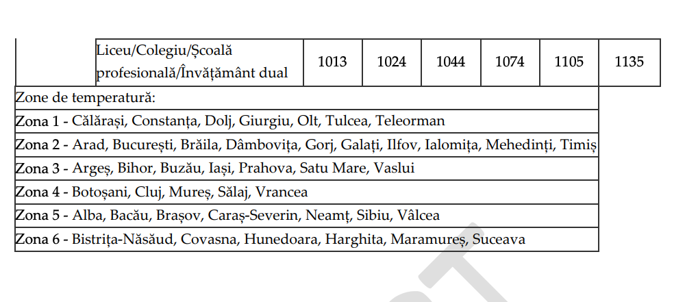 Acest coeficient se calculează diferit în funcție de zona de temperatură în care este școala, de numărul elevilor/copiilor pe care îi are înscriși și de tipul de școală/grădiniță.