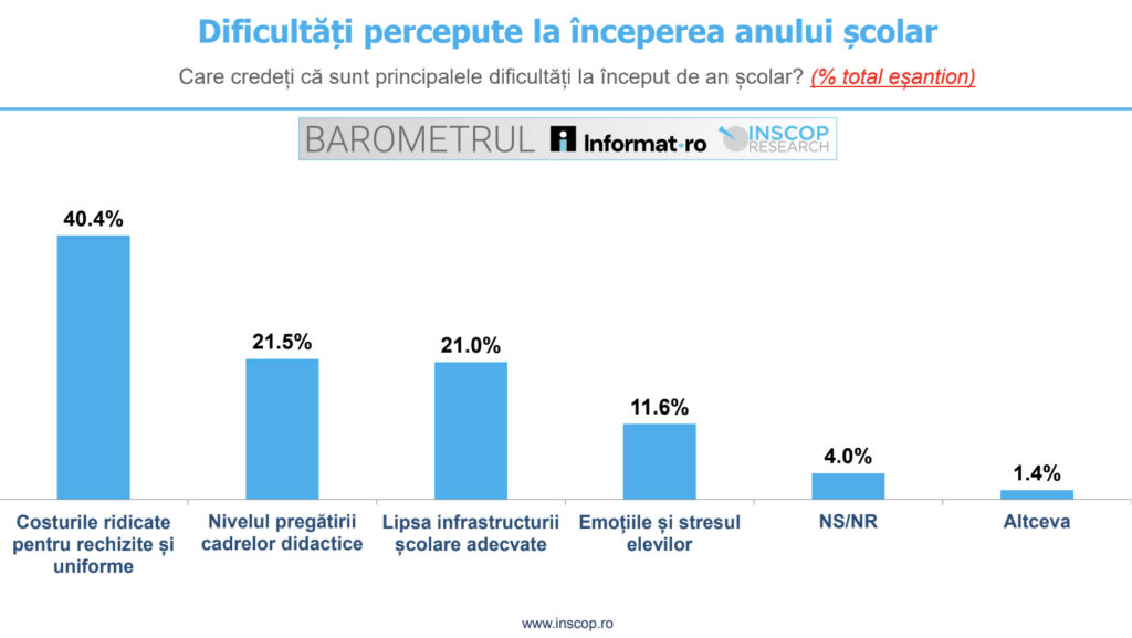 Dificultățile percepute de români la începutul anului școlar 2025-2026 sunt legate de costurile ridicate pentru rechizite și uniforme, nivelul de pregătire al profesorilor, lipsa infrastructurii școlare adecvate și stresul și emoțiile elevilor, conform rezultatelor Barometrului Informat.ro – INSCOP Research, publicate pe 12 septembrie.