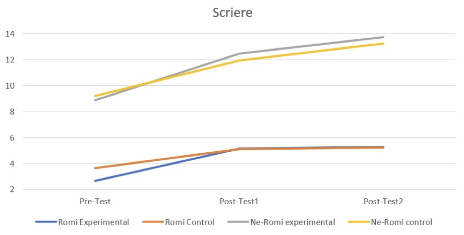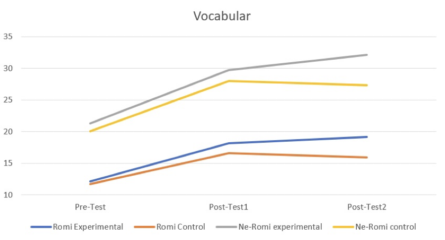 Însă un aspect deosebit de important îl reprezintă faptul că evoluția vocabularului elevilor romi și ne-romi din grupa experimentală a continuat și după finalizarea proiectului (între Post-Test 1 și Post-Test 2), ceea ce înseamnă că impactul pozitiv al proiectului s-a văzut nu doar prin efectele de transfer asupra vocabularului general, dar prin faptul că aceste efecte s-au intensificat (nu doar s-au menținut) în perioada post-intervenție.