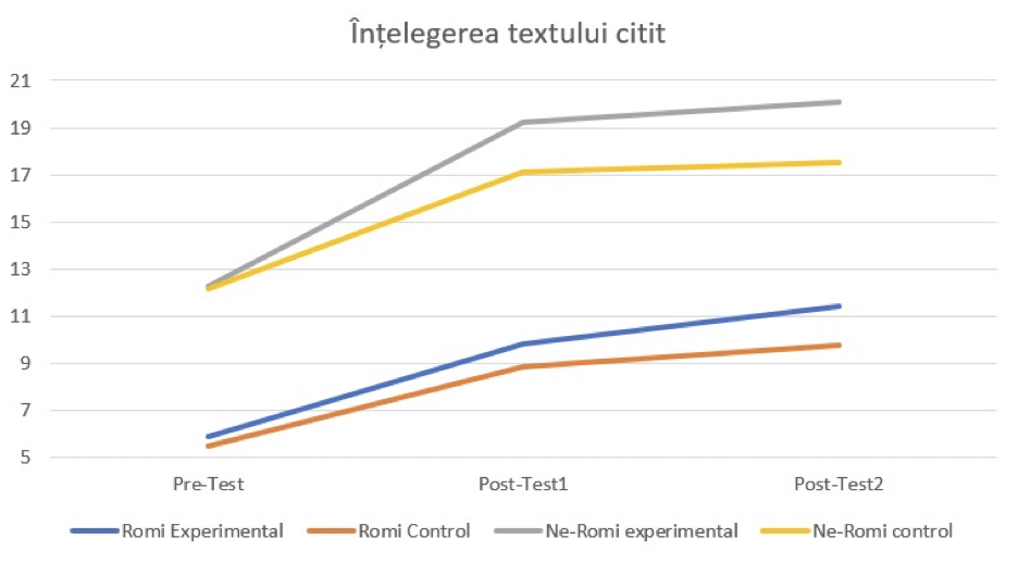 Din nou, dacă ne uităm la performanța elvilor romi din grupul experimental și ne-romi din grupul de control în perioada post-intervenție (Post-Test 1 și Post-Test 2), vedem că dezvoltarea înțelegerii textului citit a fost mai accentuală în cazul elevilor romi. Acesta este o altă dovadă a eficienței unui program de reducere a inegalităților dintre elevii romi și ne-romi.
