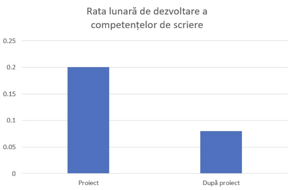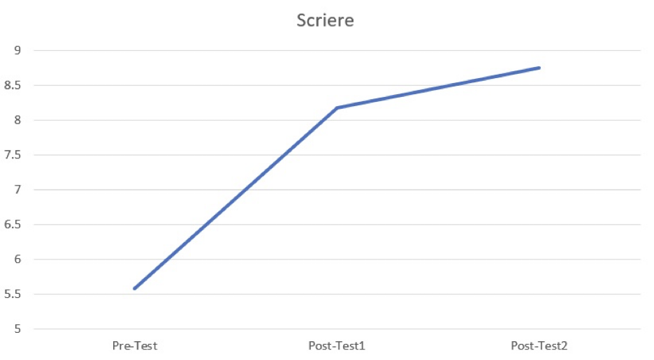 Unul dintre rezultatele importante ale acestui proiect este efectul dezvoltării limbajului oral asupra competențelor de scriere ale elevilor, la o sarcină de compunere. În ciuda faptului că elevii au desfășurat activități orale, figurile de mai jos arată că dezvoltarea scrierii a fost mai accentuată în perioada proiectului (între Pre-Test și Post-Test 1) comparativ cu perioada de după proiect (între Post-Test1 și Post-Test2). Acest lucru înseamnă că dezvoltarea limbajului elevilor i-a ajutat să scrie propoziții mai complexe, mai bine structurate și mai coerente.