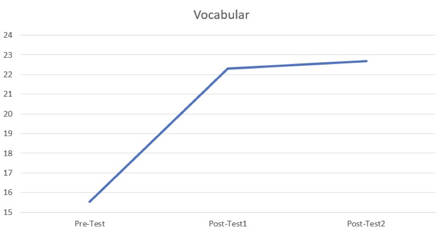 De unde știm asta? În figura de mai jos se poate vederea că dezvoltarea vocabularului general a fost mai accentuată pe parcursul proiectului (între Pre-Test și Post-Test 1) decât în perioada care a trecut după finalizarea lui (Post-Test 1 și Post-Test 2).