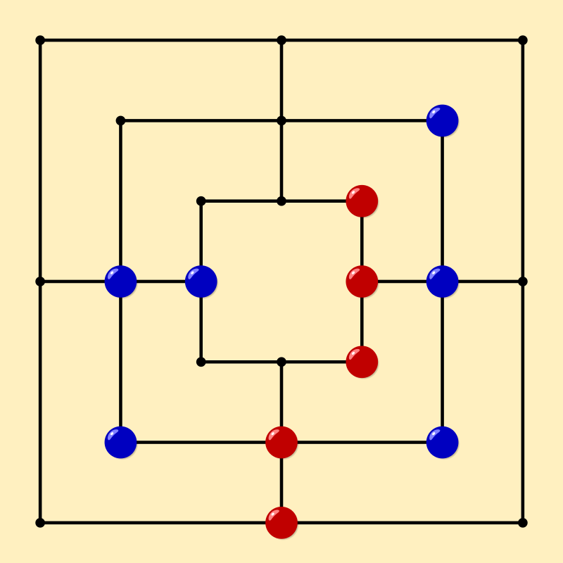 1. Fiecare jucător, pe rând, va pune una din piesele proprii pe tabla de joc. Acestea pot fi așezate în cele 24 de poziții, respectiv în punctele care sunt marcate în colțurile dreptunghiurilor și mijloacele laturilor. Etapa se va termina când toate piesele au fost puse pe tabla de joc.