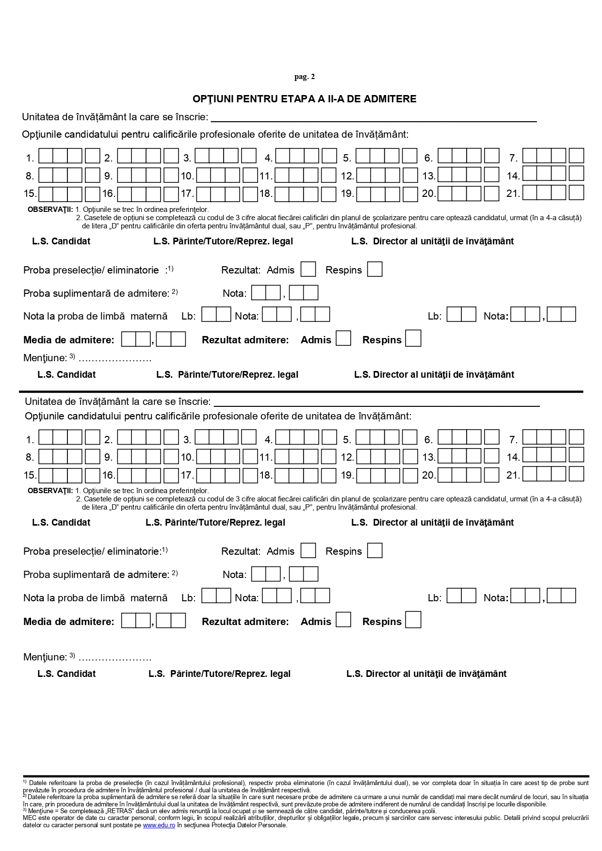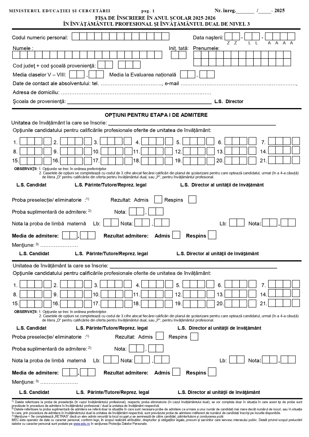 Fișa de înscriere în învățământul profesional și învățământul dual de nivel 3 – 2025