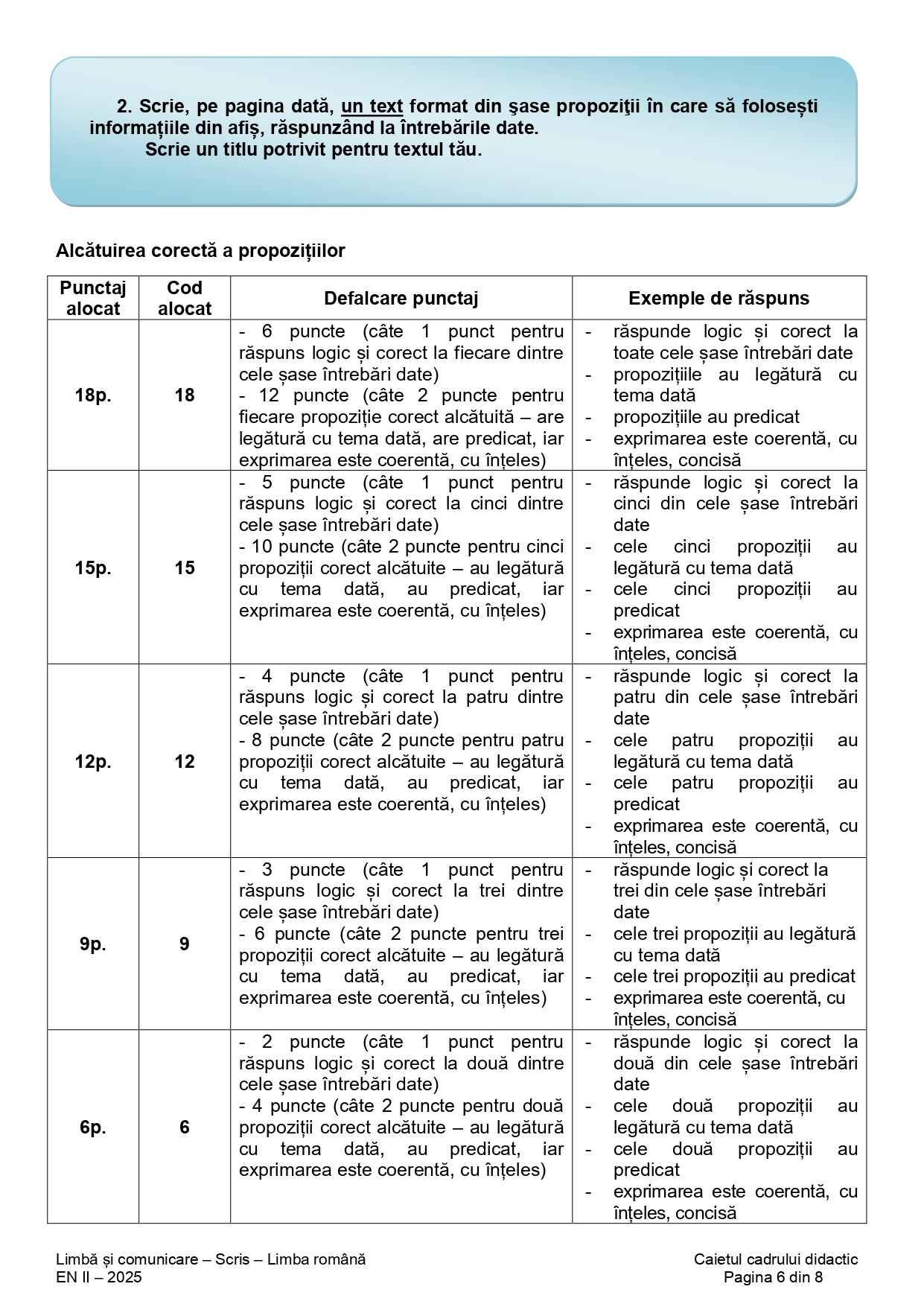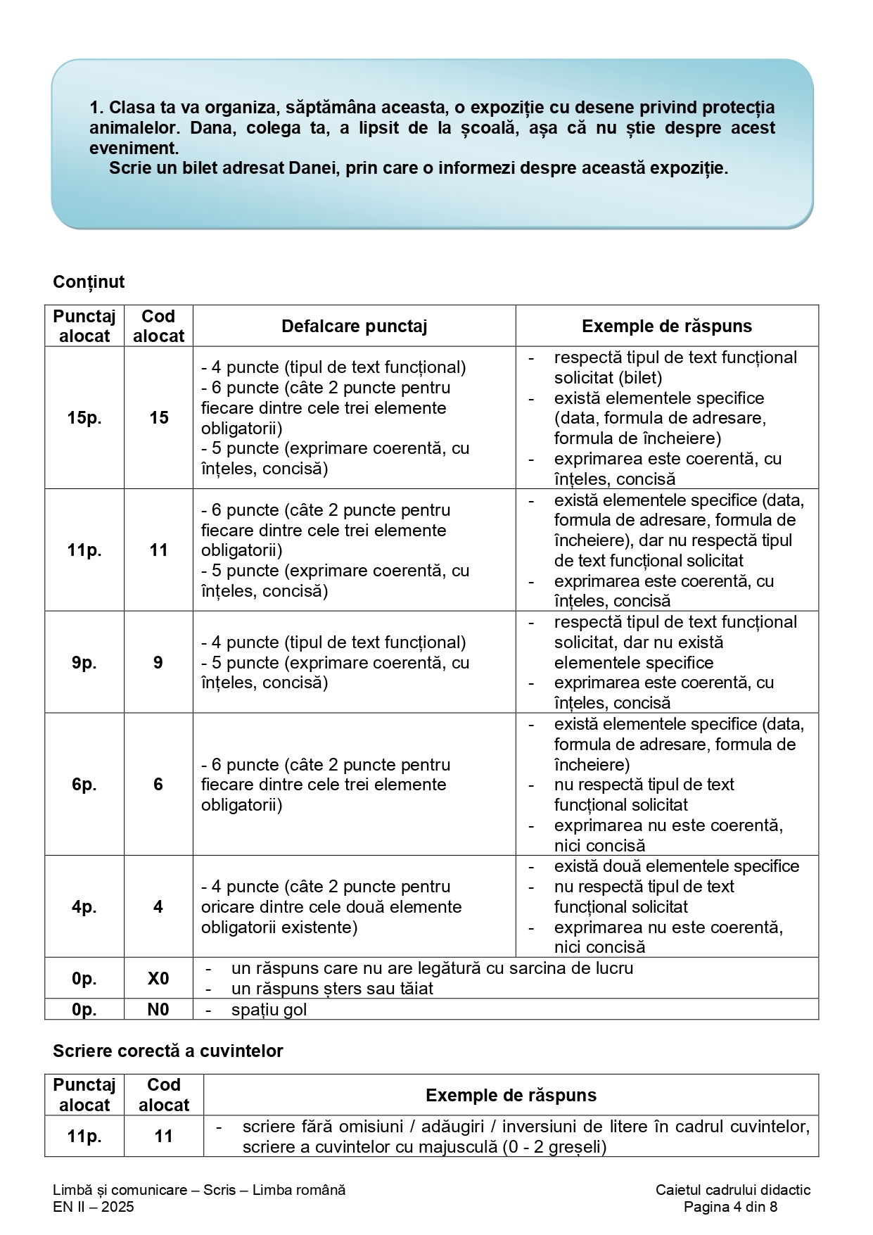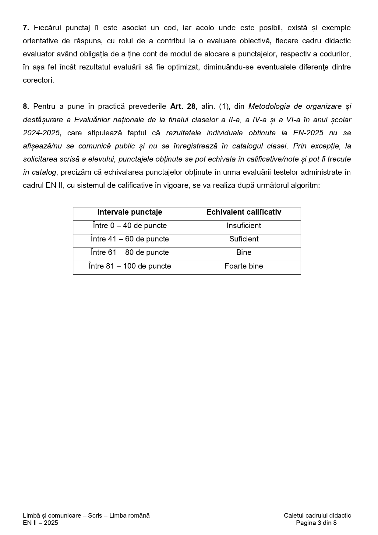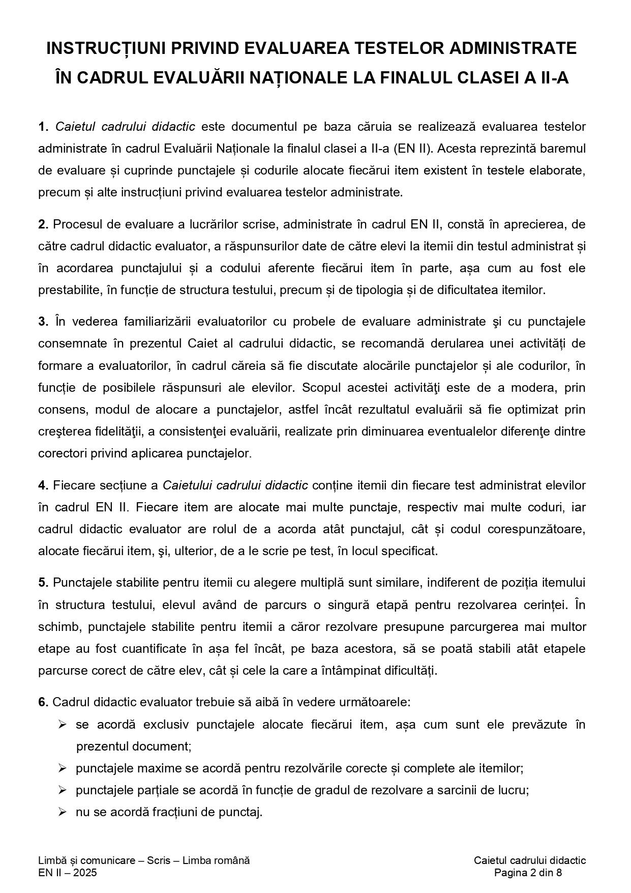 „Caietul cadrului didactic este documentul pe baza căruia se realizează evaluarea testelor administrate în cadrul Evaluării Naționale la finalul clasei a II-a (EN II). Acesta reprezintă baremul de evaluare și cuprinde punctajele și codurile alocate fiecărui item existent în testele elaborate, precum și alte instrucțiuni privind evaluarea testelor administrate”, se arată în document.