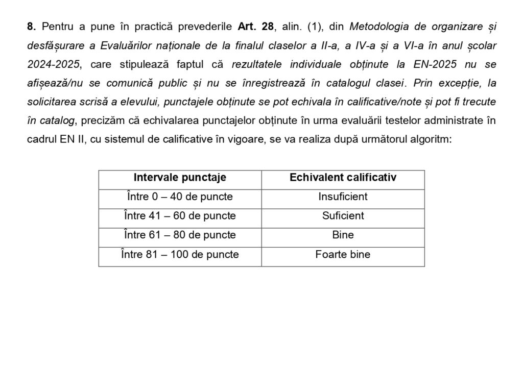 Art. 28. — „(1) Rezultatele individuale obținute la EN-2025 nu se afișează/nu se comunică public și nu se înregistrează în catalogul clasei. Prin excepție, la solicitarea scrisă a elevului, punctajele obținute se pot echivala în calificative/note și pot fi trecute în catalog. Rezultatele sunt valorificate la nivelul unității de învățământ prin: