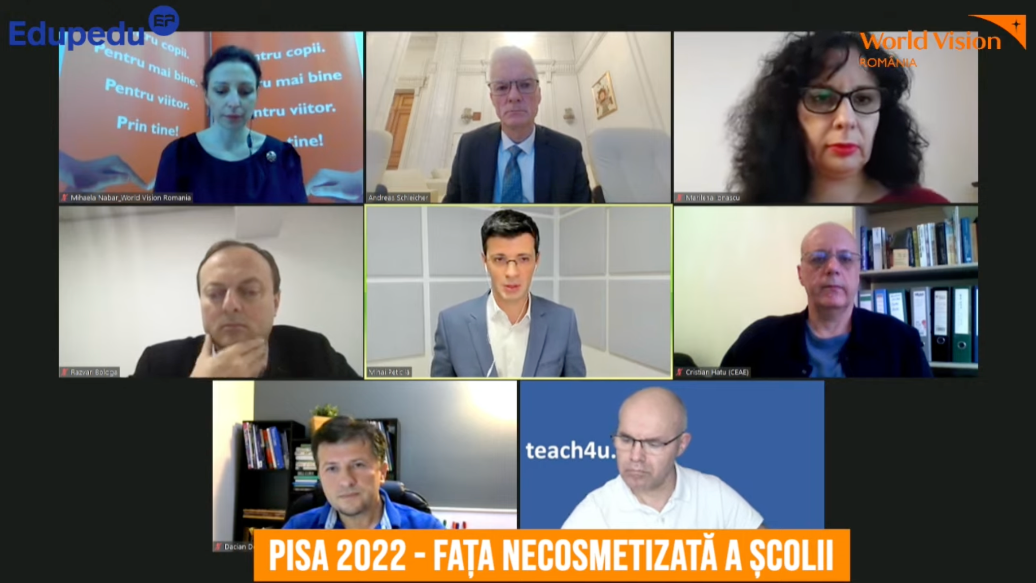 Dezbaterea online „PISA 2022 – fața necosmetizată a școlii. Cheia reală de citire a rezultatelor și opțiunile României“ este organizată de Edupedu.ro – cea mai cunoscută platformă de știri și analize din Educație din România – și World Vision România – organizație nonguvernamentală cu multiple proiecte de educație și sociale în zona școlilor și în comunitățile dezavantajate.