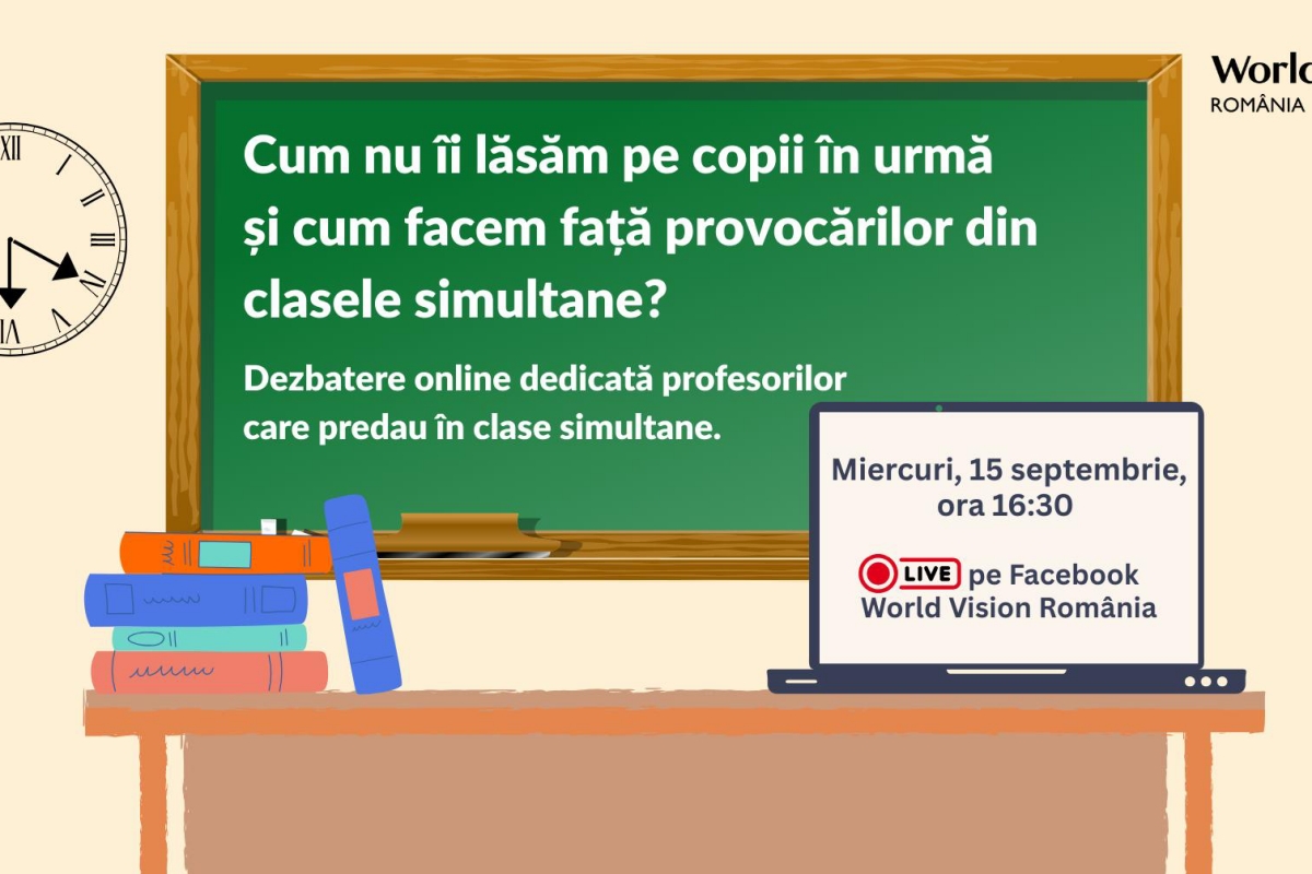 Profesorii din învățământul primar care predau la clase simultane sunt invitați la o dezbatere online luni, pe 15 septembrie, de la ora 16:30, organizată de World Vision România. Discuțiile vor aborda provocările și eventualele soluții ale predării simultane, iar organizația va prezenta metodologia aplicată timp de un an în programul „Pâine și mâine”.