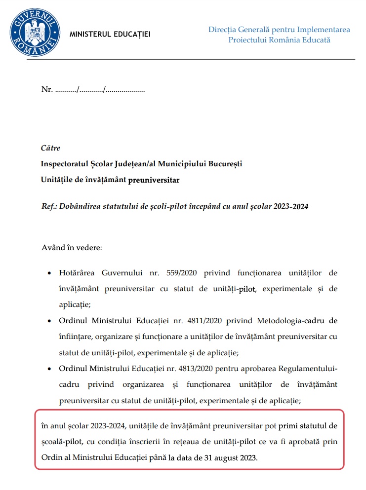 Ordin al Ministrului Educației până la data de 31 august 2023, scrie pe site-ul Ministerului Educației la categoria „Școli-pilot” și în adresa trimisă inspectoratelor școlare încă din primăvara anului acestuia.