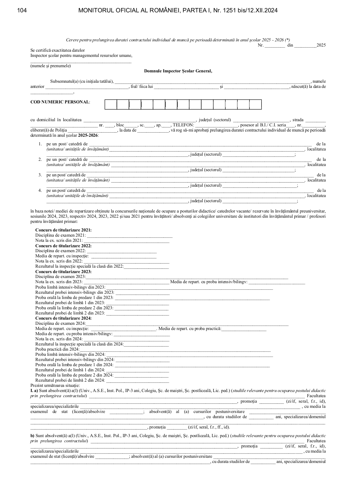 Cerere pentru prelungirea duratei contractului individual de muncă pe perioadă determinată în anul școlar 2025-2026 – inspectoratul școlar