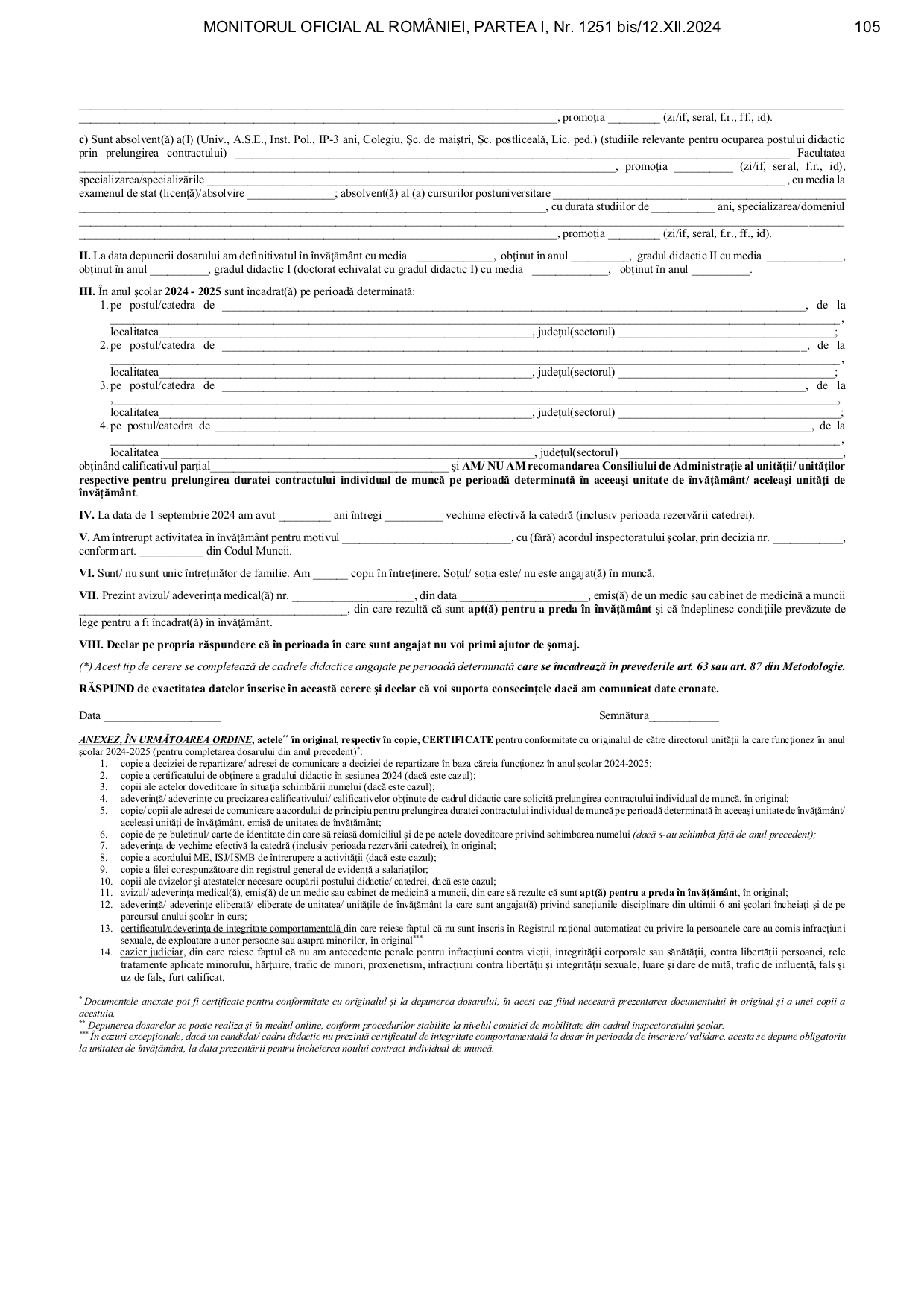 - (i) cererilor cadrelor didactice titulare, respectiv a cererilor cadrelor didactice debutante prevăzute la art. 24 alin. (4) şi (6) din Metodologie rămase cu norma didactică incompletă pentru completarea normei didactice de predare, conform prevederilor Metodologiei;