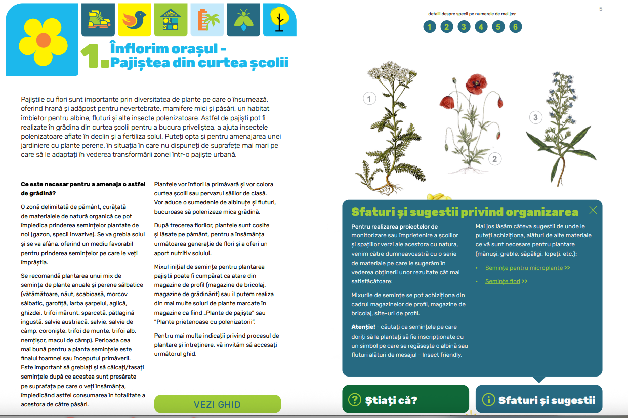 Ghidul destinat elevilor şi profesorilor conţine informaţii utile pentru: amenajarea unei pajişti cu flori în curtea şcolii, explorarea unei zone cu plante şi animale din apropierea instituţiei de învăţământ, realizarea unor hrănitori destinate păsărilor sau a unor hoteluri pentru insecte, amenajarea unei grădini de ploaie sau a unei instalaţii de observare a fluturilor nocturni, plantarea puieţilor.