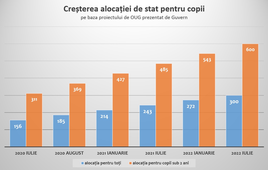 Executivul majorează în 5 rate alocațiile pentru copii, începând cu septembrie anul acesta și până la 1 iulie 2022, când se va atinge dublarea valorii lor față de cuantumul din prezent. Calendarul exact al creșterii alocațiilor este cuprins într-un proiect de Ordonanța de Urgență aflat astăzi, 29 iulie, în prima lectură a Guvernului.