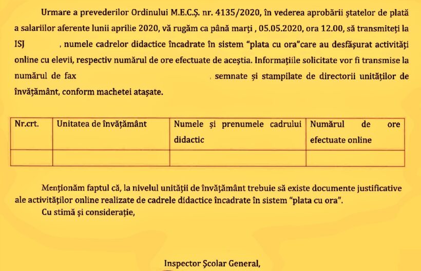Unele dintre aceste documente solicită directorilor o listă cu toate cadrele didcactice încadrate la plata cu ora care au desfășurat activități online cu elevii, respectiv numărul de ore efectuate de acestea.