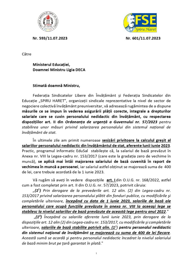 Sindicatele din Învățământ, Federația Sindicatelor Libere din Învățământ și Federația Sindicatelor din Educație „Spiru Haret”, cer ministrului Educației plata corectă a personalului nedidactic, potrivit ordonanței de urgență nr. 57/2023, după cum se arată într-un document obținut de Edupedu.ro. „Aplicația EduSal este cea care calculează greșit salariile colegilor noștri – personal nedidactic”, semnalează sindicatele. Sesizarea vine cu trei zile înainte de ziua de salariu.