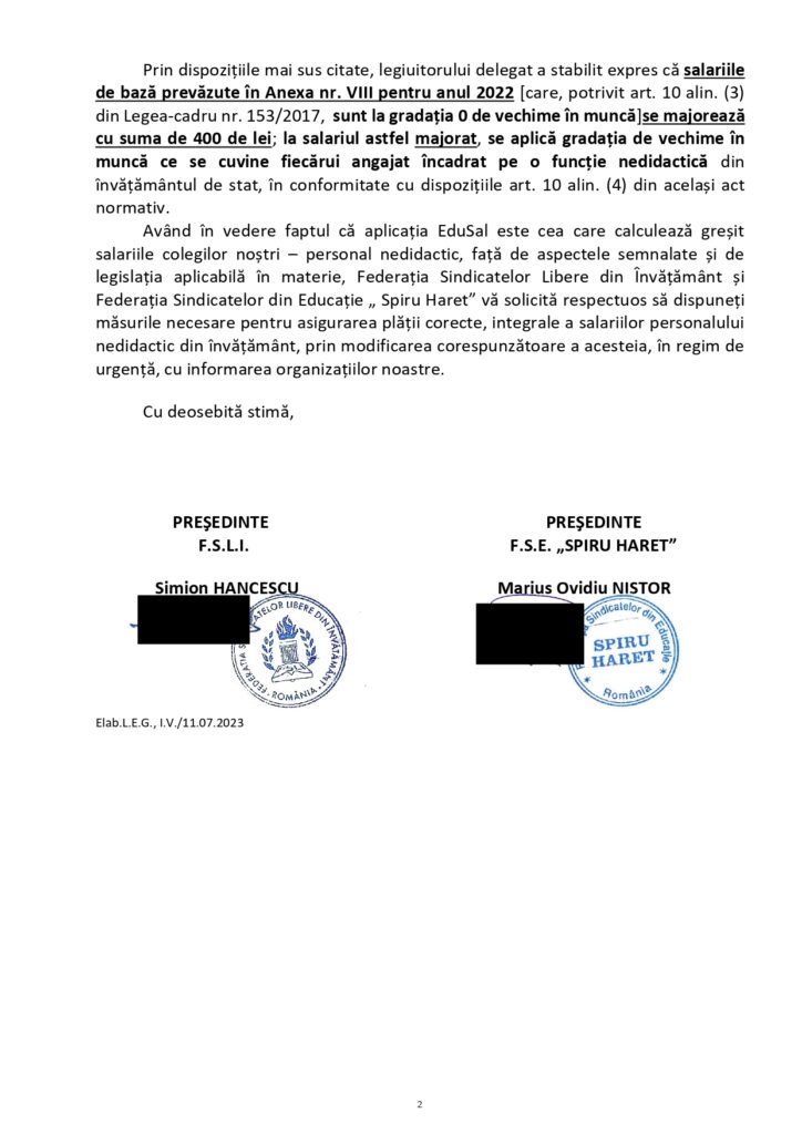 „Având în vedere faptul că aplicația EduSal este cea care calculează greșit salariile colegilor noștri – personal nedidactic, față de aspectele semnalate și de legislația aplicabilă în materie, Federația Sindicatelor Libere din Învățământ și Federația Sindicatelor din Educație „ Spiru Haret” vă solicită respectuos să dispuneți măsurile necesare pentru asigurarea plății corecte, integrale a salariilor personalului nedidactic din învățământ, prin modificarea corespunzătoare a acesteia, în regim de urgență, cu informarea organizațiilor noastre”, se arată în textul sindicatelor.
