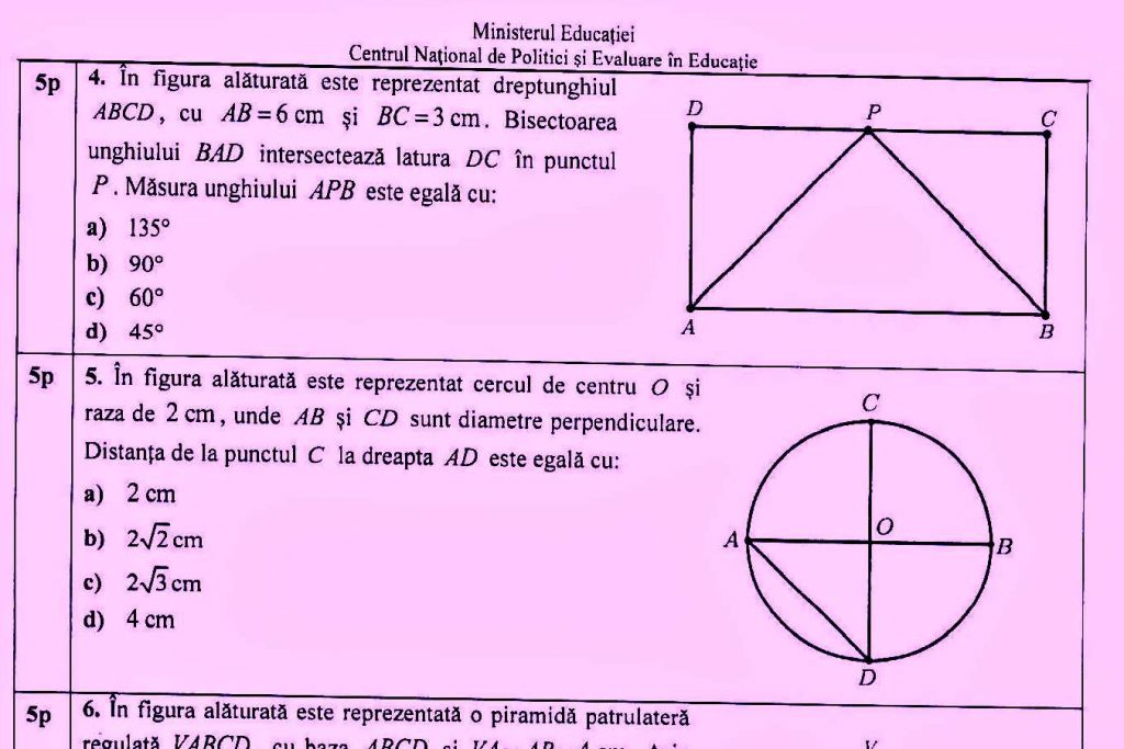 La Subiectul al II-lea au fost 6 probleme de geometrie, dar tot sub formă de itemi tip grilă, cu un singur răspuns corect, notate cu câte 5 puncte fiecare.