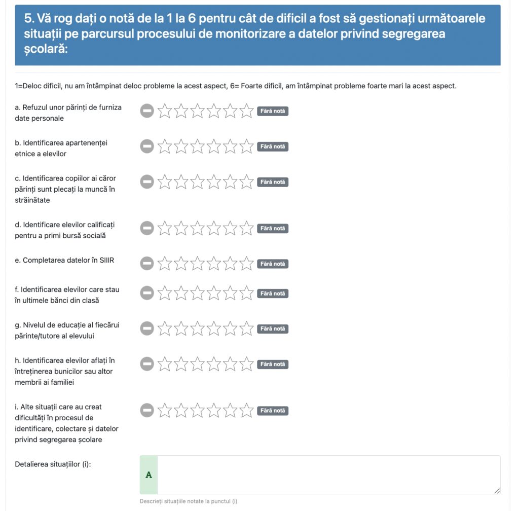 O altă cerință a fost să dea o notă de la 1 la 6 pentru cât de dificil a fost să gestioneze următoarele situații pe parcursul procesului de monitorizare a datelor privind segregarea școlară: