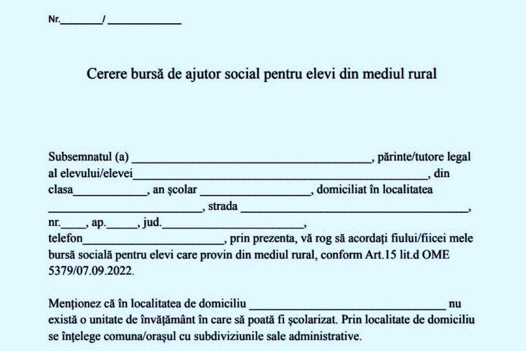 Model de cerere bursă de ajutor social pentru elevi din mediul rural: