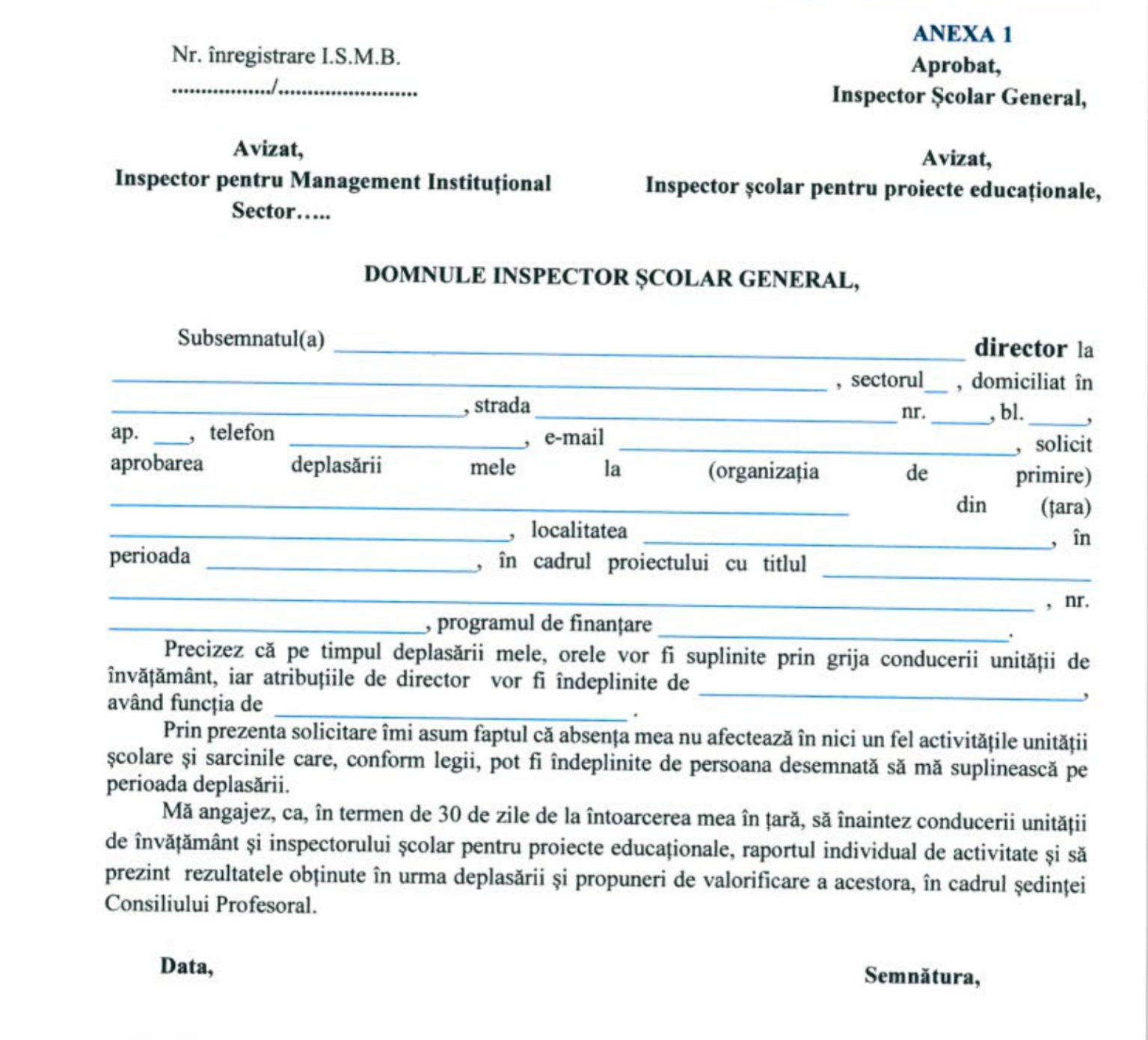 Cadrele didactice, directorii și inspectorii școlari care doresc să participe la proiecte educaționale desfășurate în afara țării trebuie să completeze cererile de mai jos, însoțite de documente precum invitația organizatorilor, programul activităților și o adeverință care atestă interesul educațional al deplasării.