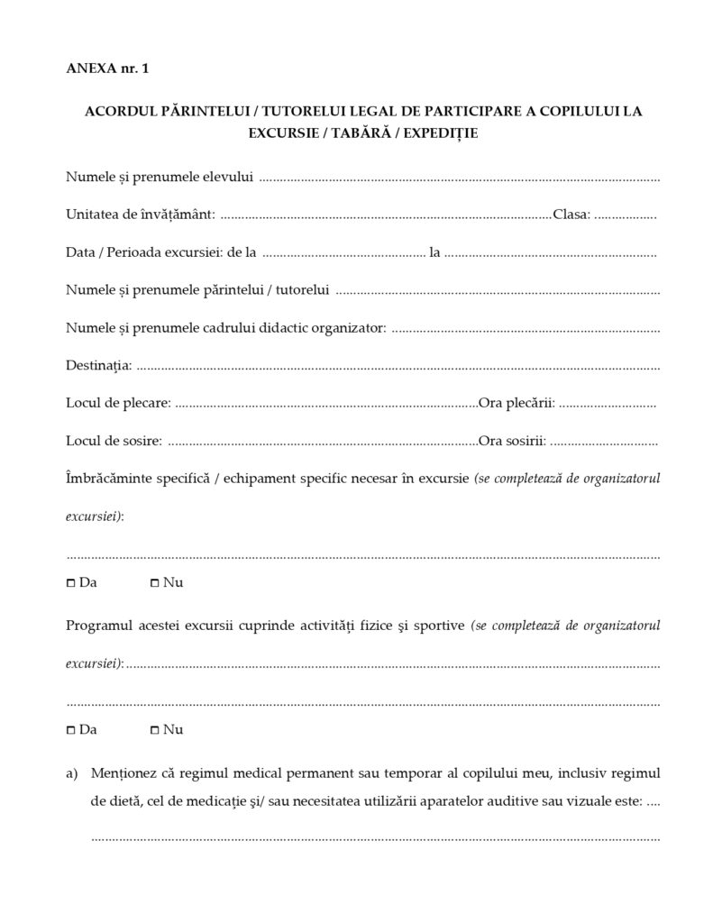 În situația în care excursia are loc în afara localității, pe lângă documentele menționate mai sus, sunt necesare și adeverinţele medicale eliberate de medicul de familie/medicul şcolar, care să ateste faptul că starea de sănătate îi permite să participe la activităţile propuse, mijloacele de transport, condițiile de cazare și masă, informații privind costul activității.