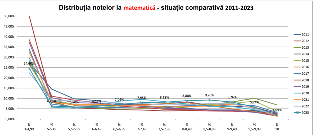 Tot Vaslui este județul cu cele mai multe note între 5 – 5,49: adică 9,2% dintre elevii care s-au prezentat la proba de matematică.