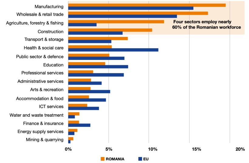 Iar pe piața muncii la nivel național se fac simțite diferențe substanțiale față de mediile europene. Unele domenii atrag considerabil mai mulți angajați: producție (20%, față de media UE de 16%), vânzări retail și angro (17% față de 13%), agricultură (12% față de doar 4% la nivel UE), construcții (10%, cea mai mare pondere în rândul țărilor europene). Aceste domenii revendică, împreună, mai bine de jumătate din totalul angajaților din România.