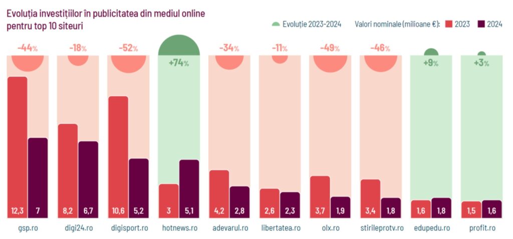 Creșterea apare în condițiile în care, la nivelul întregii piețe, raportul MIP al BRAT semnalează o scădere de 17% față de 2023, pentru investițiile în publicitatea online la nivel local.