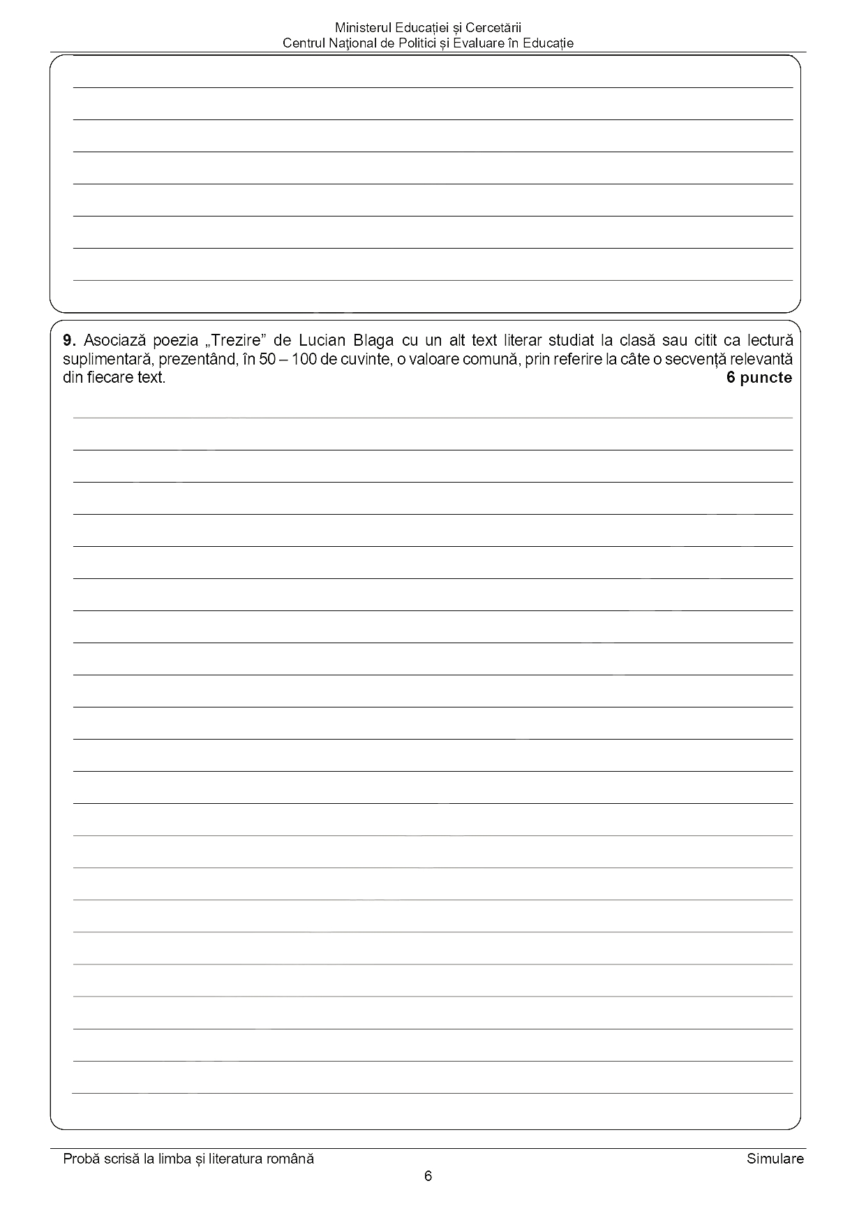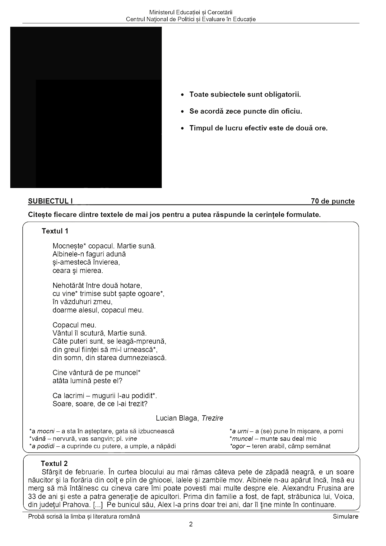 Elevii de clasa a VIII-a au primit două texte la prima vedere la simularea probei de Limba și literatura română de la Evaluarea Națională 2025, potrivit subiectelor consultate de Edupedu.ro. Primul text este poezia „Trezire” de Lucian Blaga, iar al doilea este din articolul jurnalistei Cristina Ștefan „Rezistența prin apicultură”, publicat în Dilema veche în 2017.