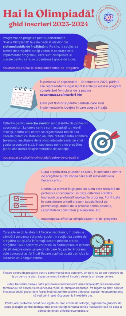 Elevii pasionați de fizică, matematică sau informatică se pot înscrie la cursuri gratuite de pregătire ținute de profesori voluntari în centre stabilite în peste 15 județe, potrivit Fundației „Nouă ne pasă”, care anunță deschiderea înscrierilor în noua ediție a programului „Hai la olimpiadă!”. Participarea la cursuri este gratuită, după ce elevii trec printr-o selecție.