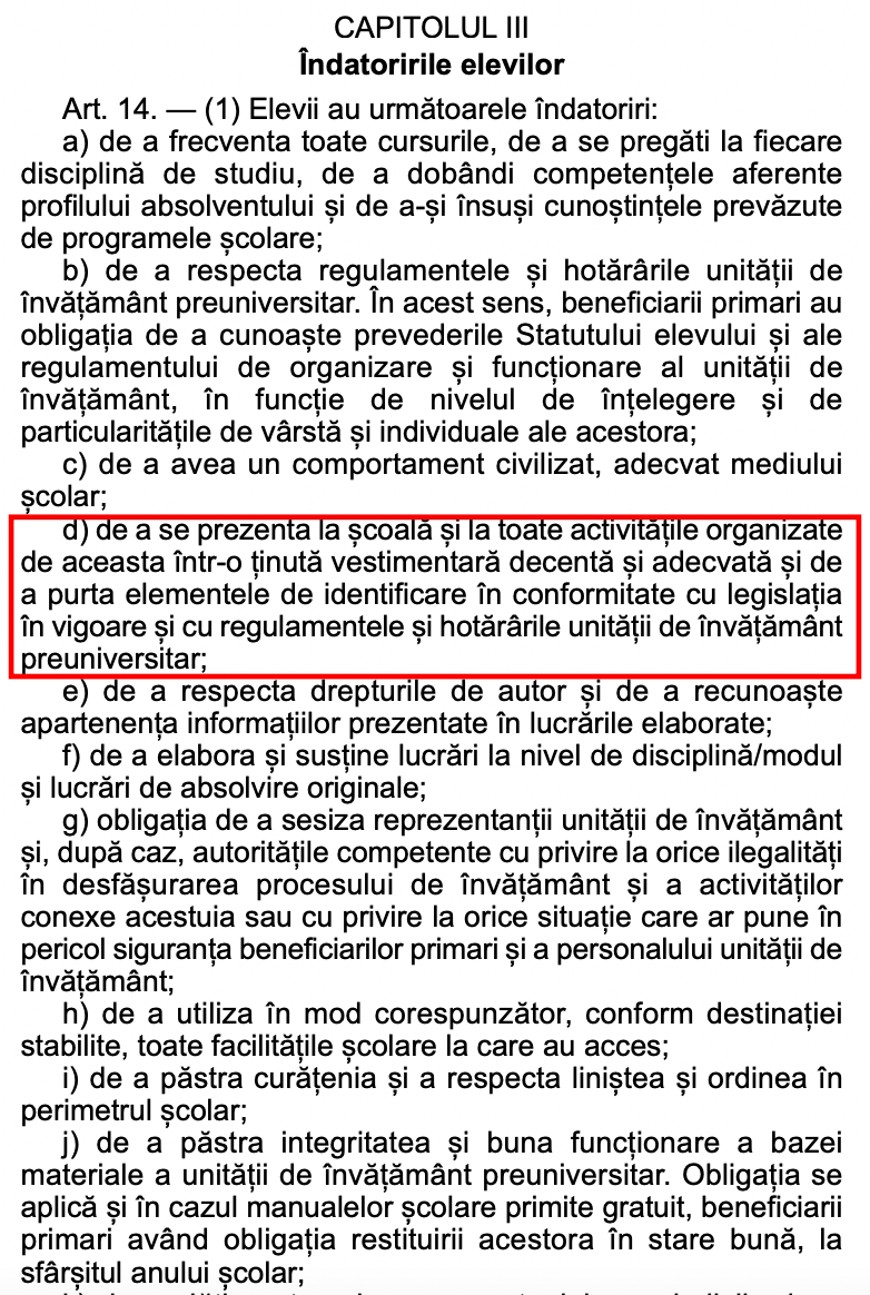 Art. 14. — „(1) Elevii au următoarele îndatoriri: d) de a se prezenta la școală și la toate activitățile organizate de aceasta într-o ținută vestimentară decentă și adecvată și de a purta elementele de identificare în conformitate cu legislația în vigoare și cu regulamentele și hotărârile unității de învățământ preuniversitar”, conform Statutului Elevului 2024.