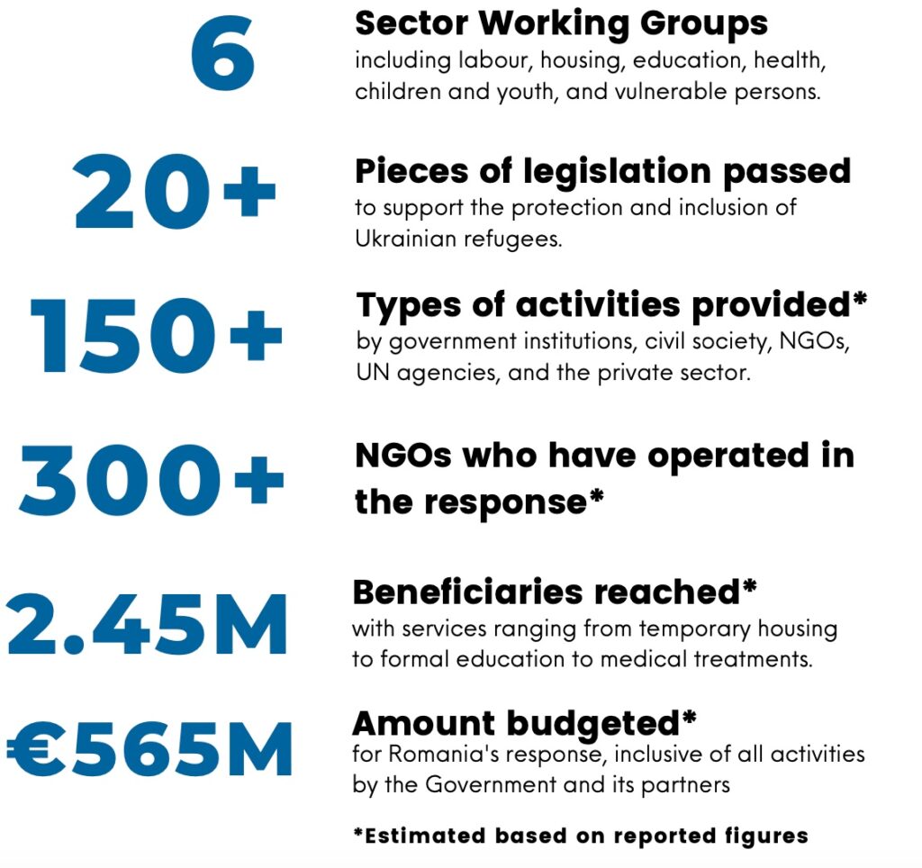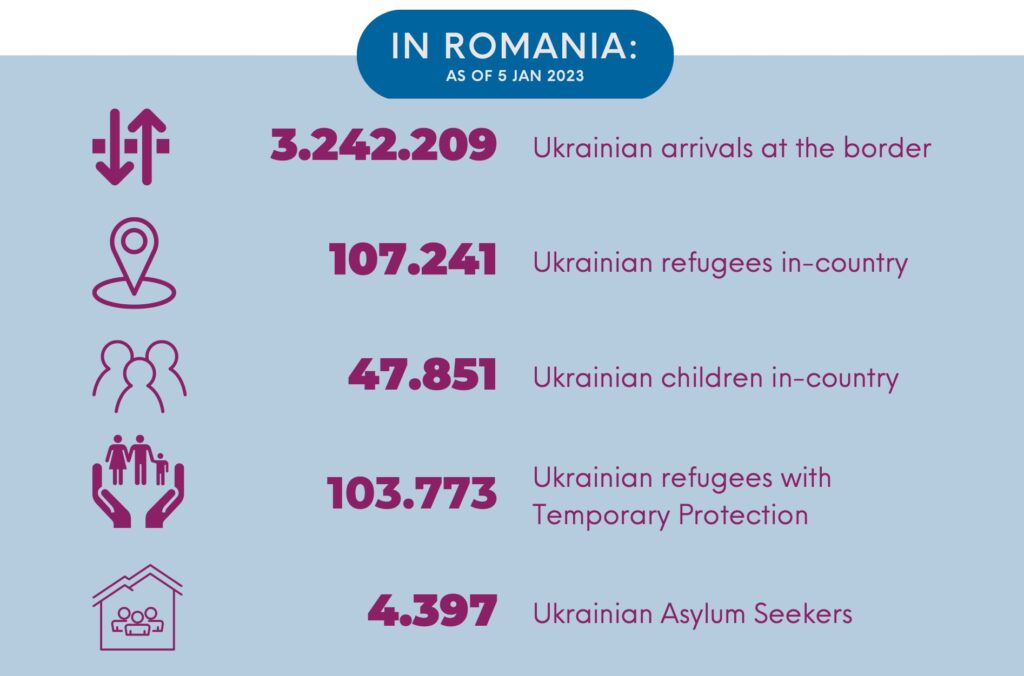 - Access to labor market: “the propensity to join the labor market by Ukrainian refugees is generally low for many reasons, including lack of acceptance that the conflict may be prolonged, low uptake of available Romanian language and entrepreneurship courses, and limited community outreach to promote job opportunities.”