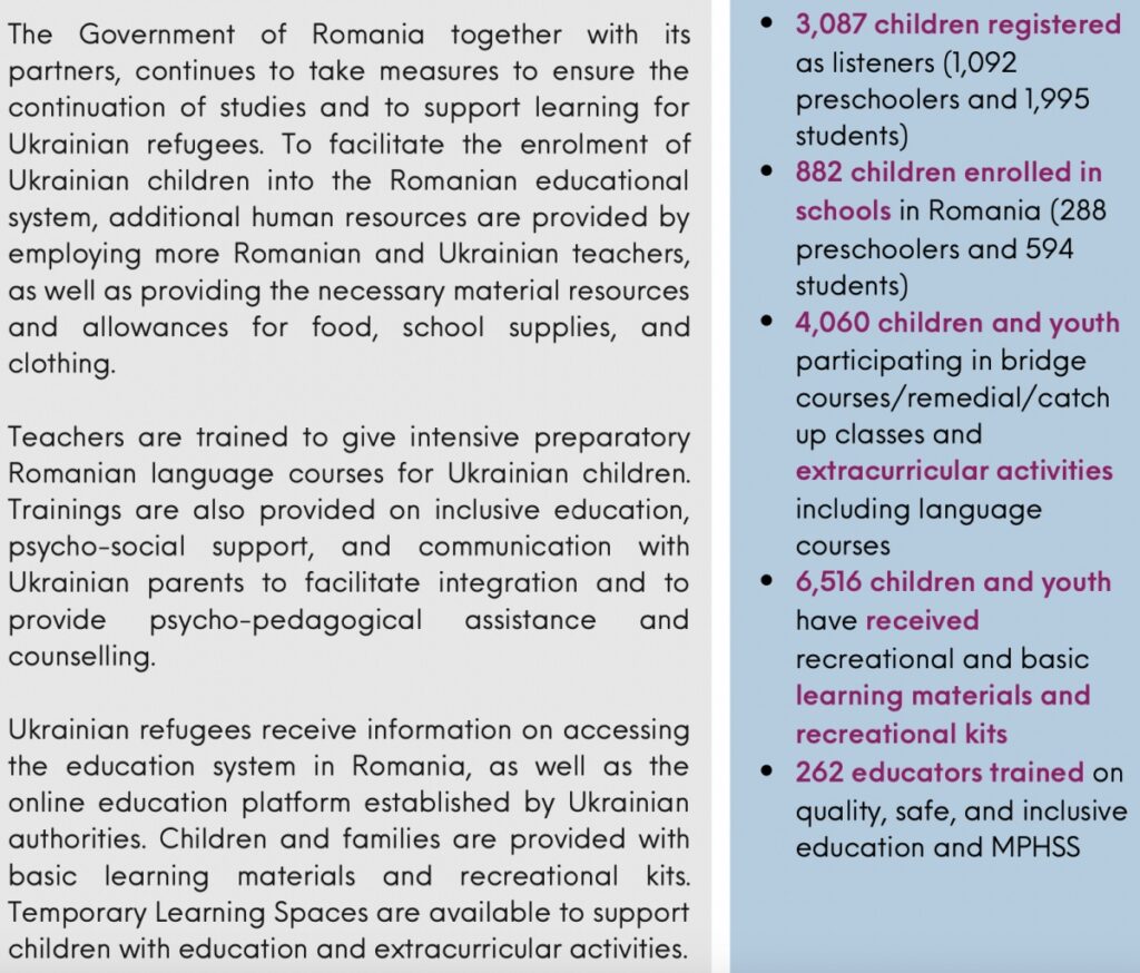 The document says the Government, “together with its partners, continues to take measures to ensure the continuation of studies and to support learning for Ukrainian refugees. To facilitate the enrolment of Ukrainian children into the Romanian educational system, additional human resources are provided by employing more Romanian and Ukrainian teachers, as well as providing the necessary material resources and allowances for food, school supplies, and clothing.”
