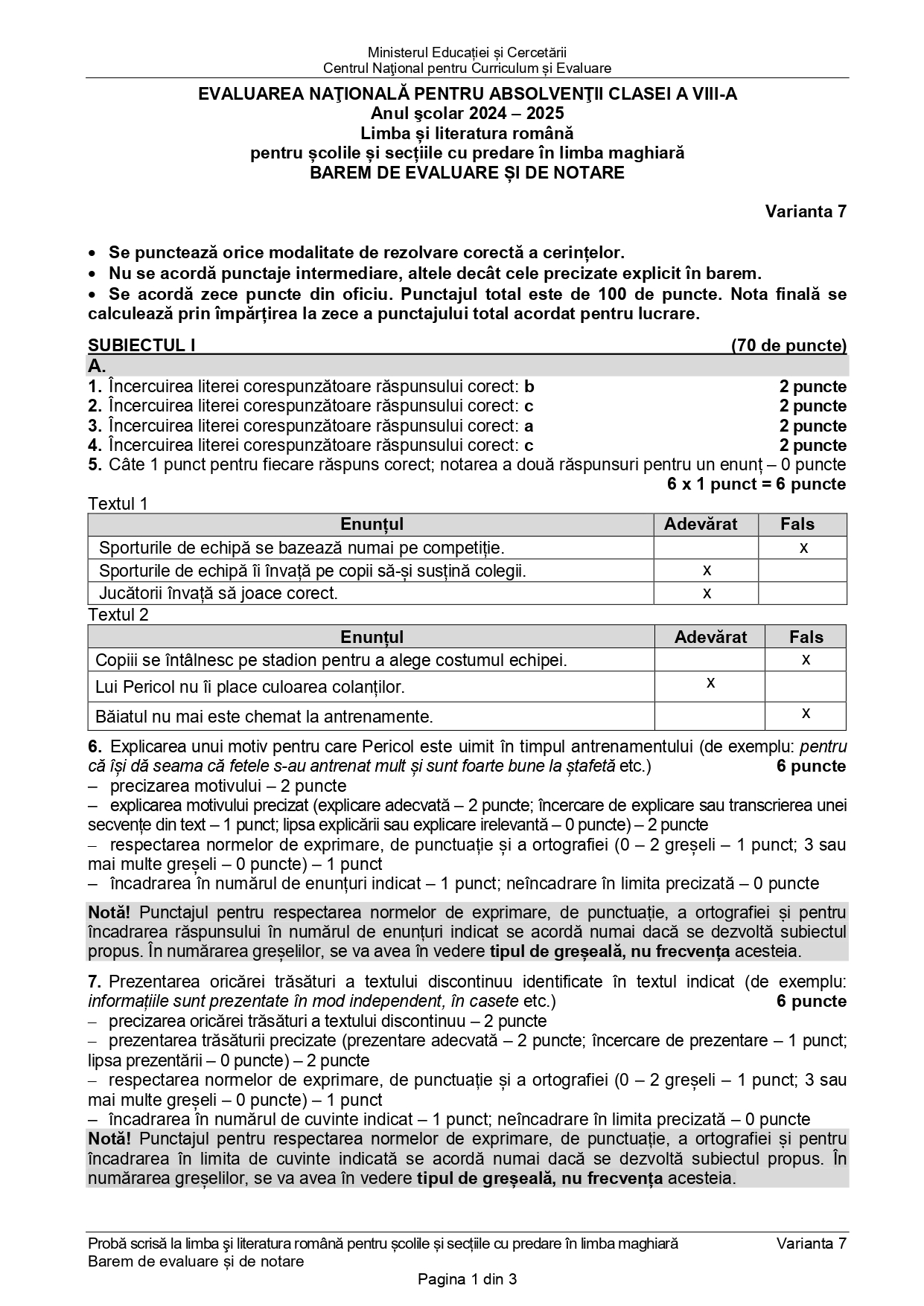Ministerul Educației a publicat la ora 15:00 baremul de corectare de la proba de Limba Română de la Evaluarea Națională 2025. Luni, 23 iunie, absolvenții clasei a VIII-a au susținut proba scrisă la Limba și literatura română. Descarcă mai jos baremul de corectare și subiectele.