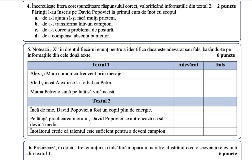 La subiectul I, textul 2, elevii au avut de rezolvat cerințe pe baza unui interviu cu David Popovici, Efortul este esența procesului de învățare, realizat de Alina Necșulescu, pentru dilema.ro.