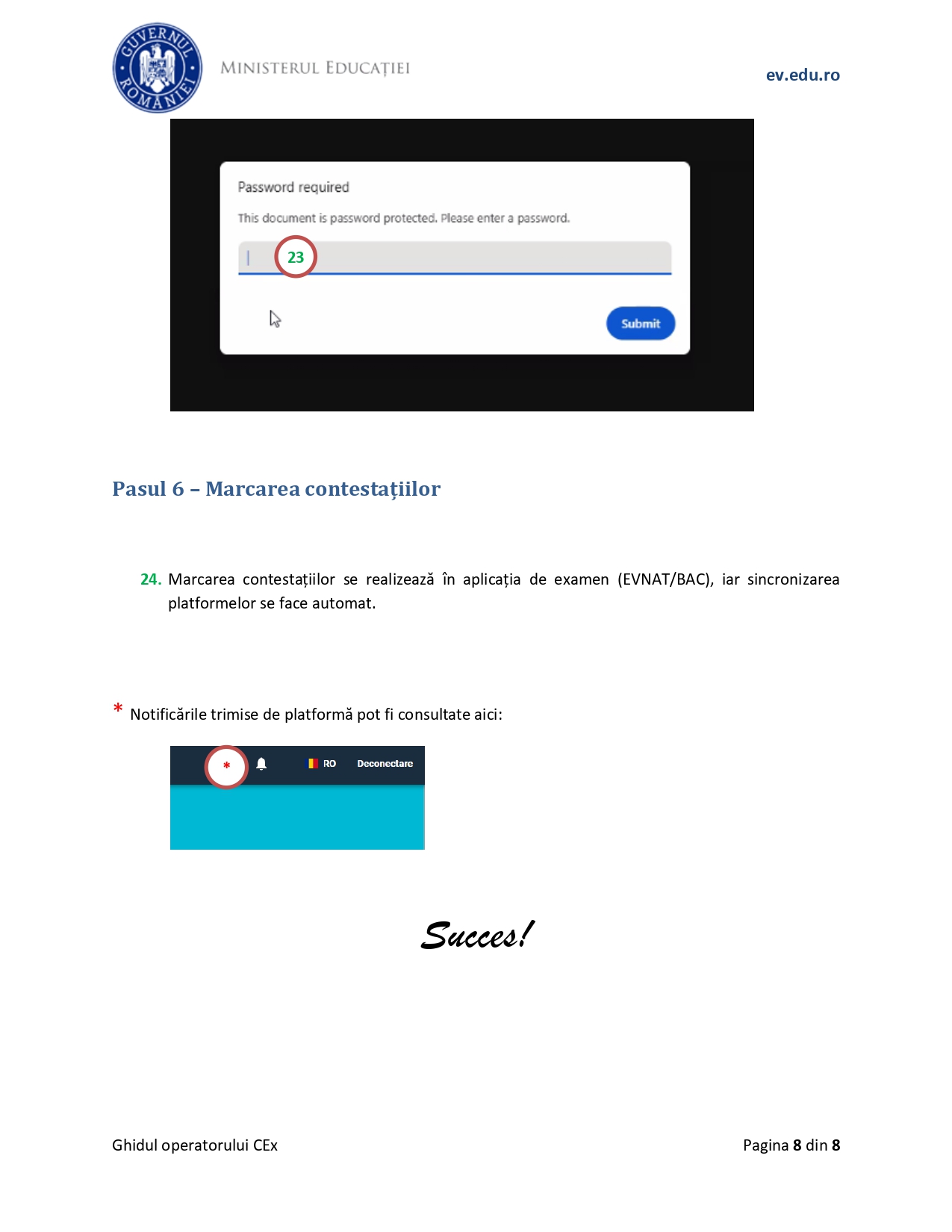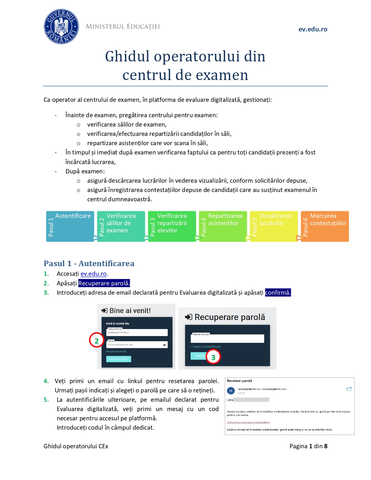 Ghidul operatorului din centrul de examen (Evaluare Națională 2025) conține informații despre autentificare, verificarea sălilor de examen, verificarea repartizării elevilor, repartizarea asistenților, vizualizarea lucrărilor și marcarea contestațiilor, potrivit unui document consultat de Edupedu.ro. Vezi mai jos, în articol, indicațiile pentru fiecare pas.