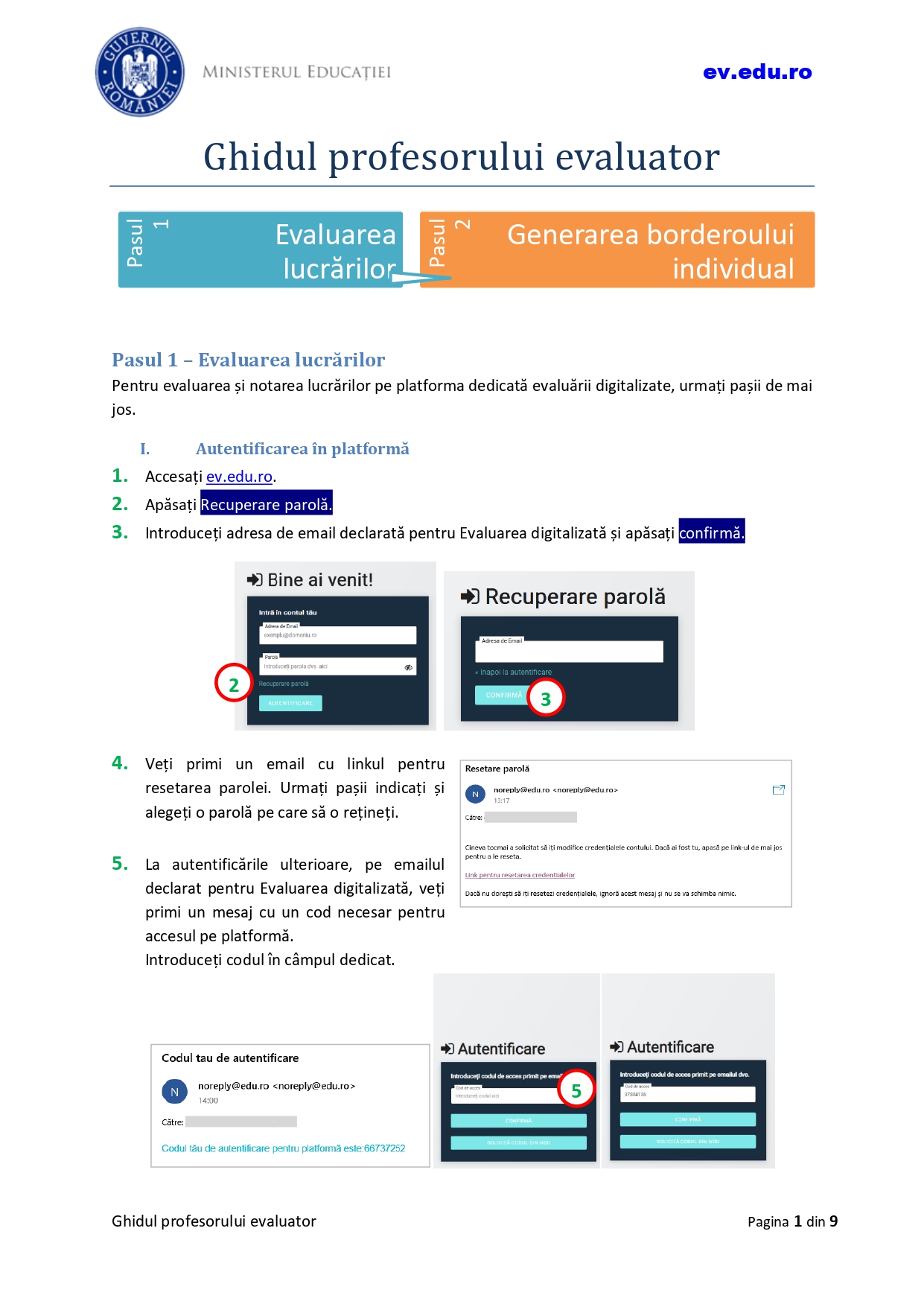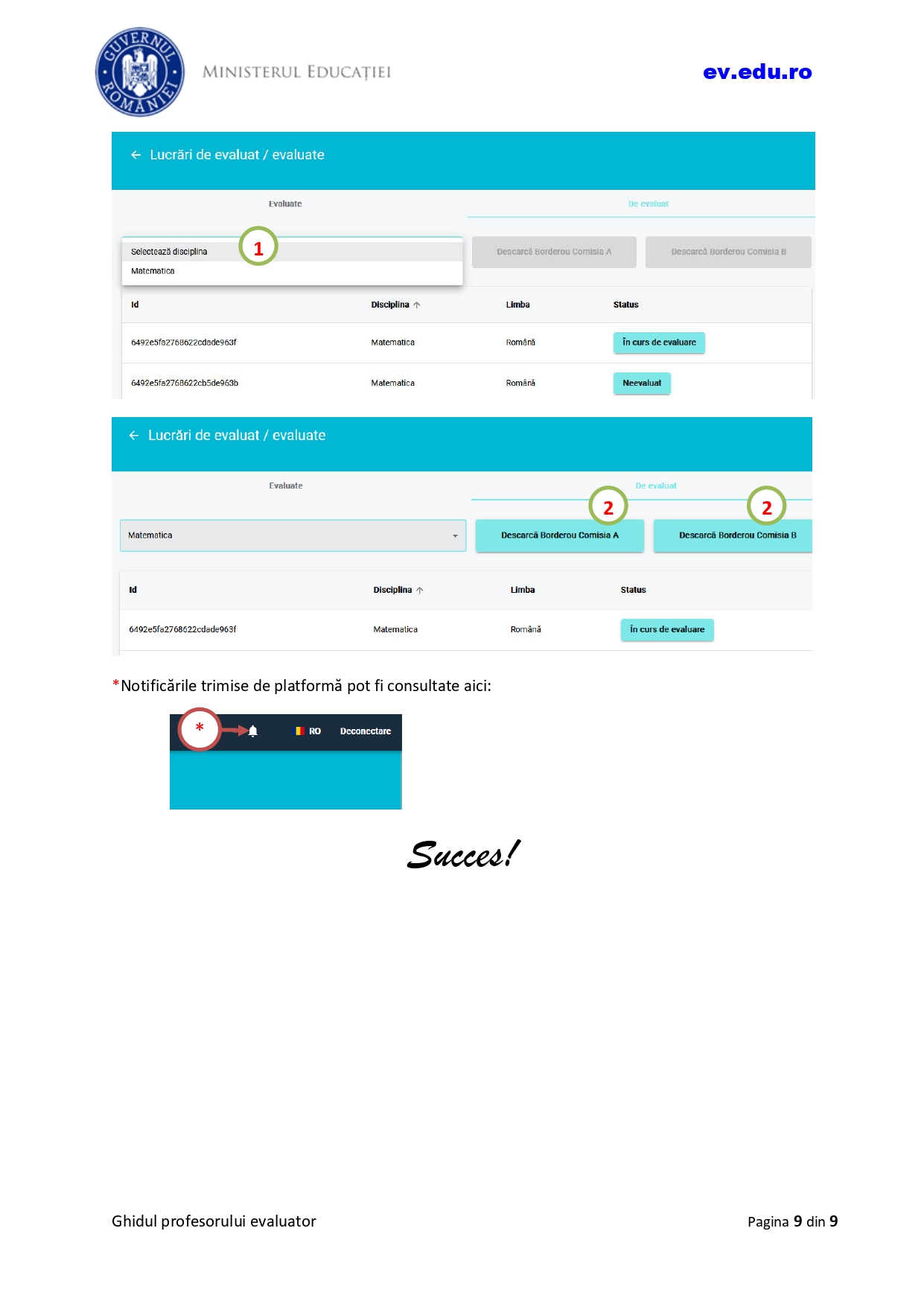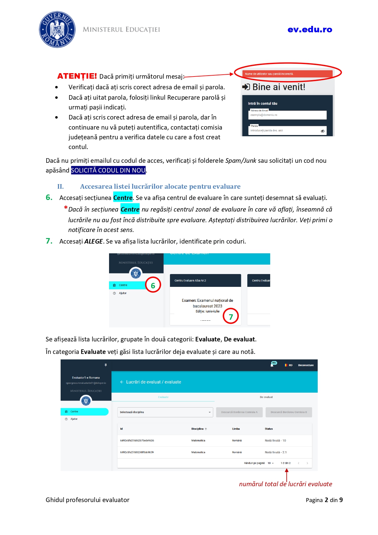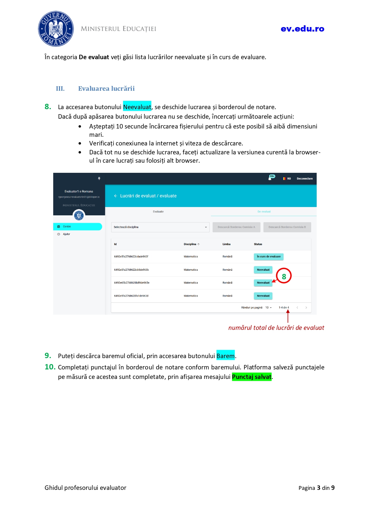 Conform ghidului, pentru evaluarea și notarea lucrărilor pe platforma dedicată evaluării digitalizate, trebuie urmați următorii pași: