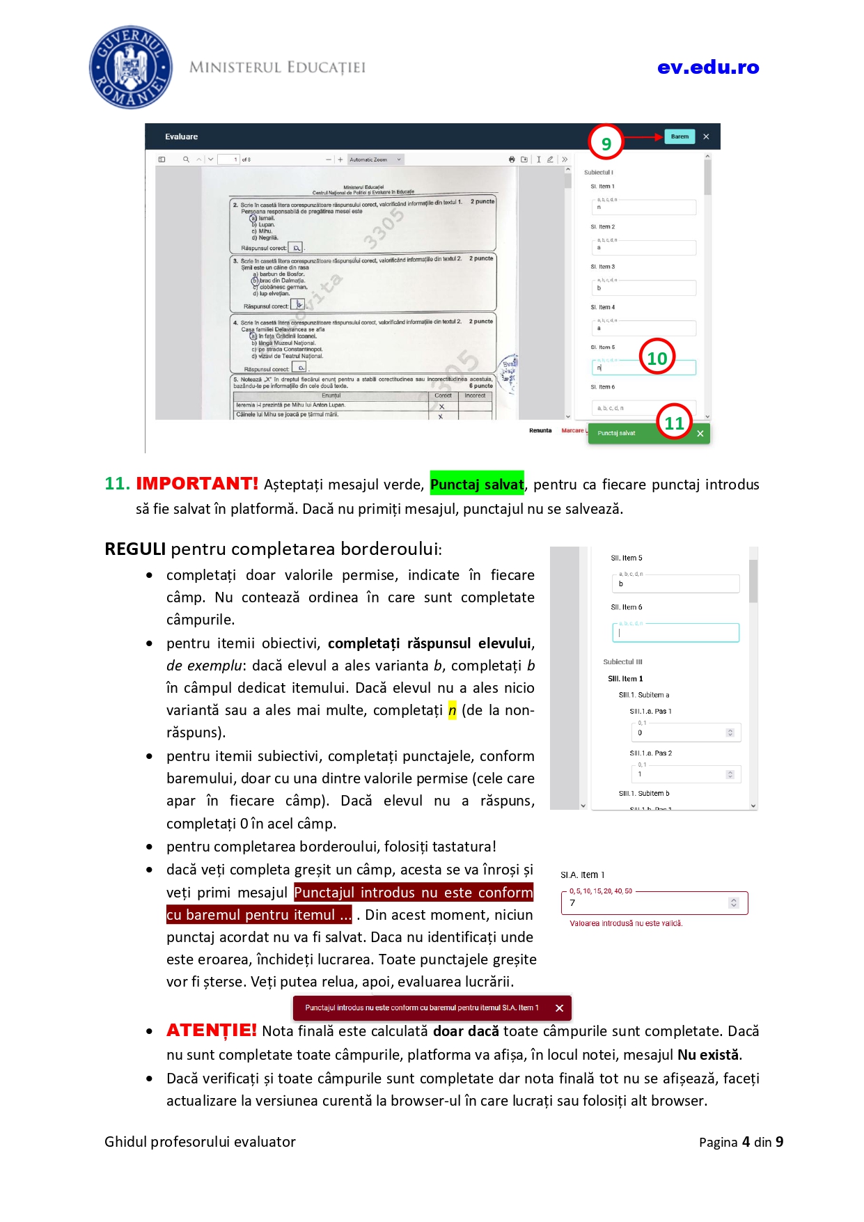Potrivit documentului, nota finală este calculată doar dacă toate câmpurile sunt completate. Dacă nu sunt completate toate câmpurile, platforma va afișa, în locul notei, mesajul „Nu există”.