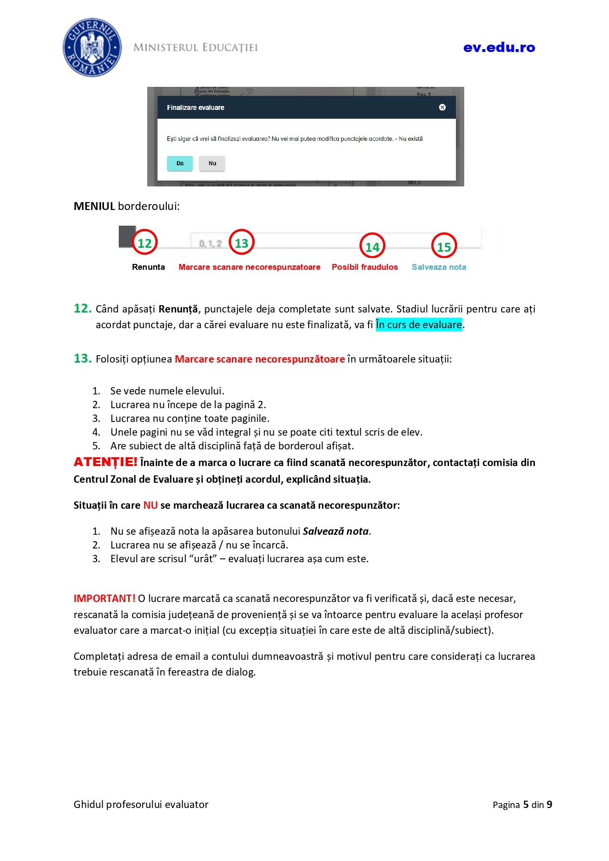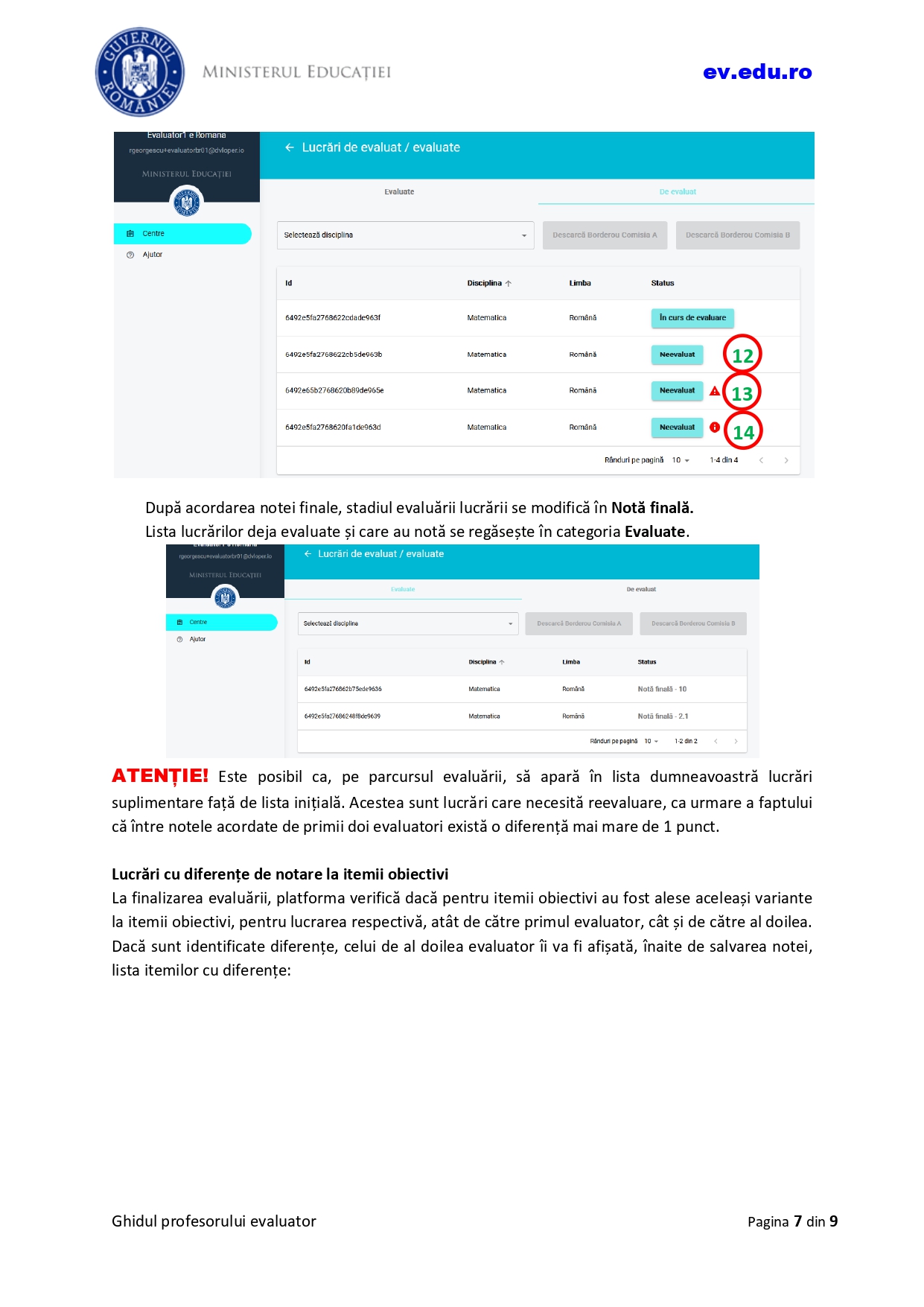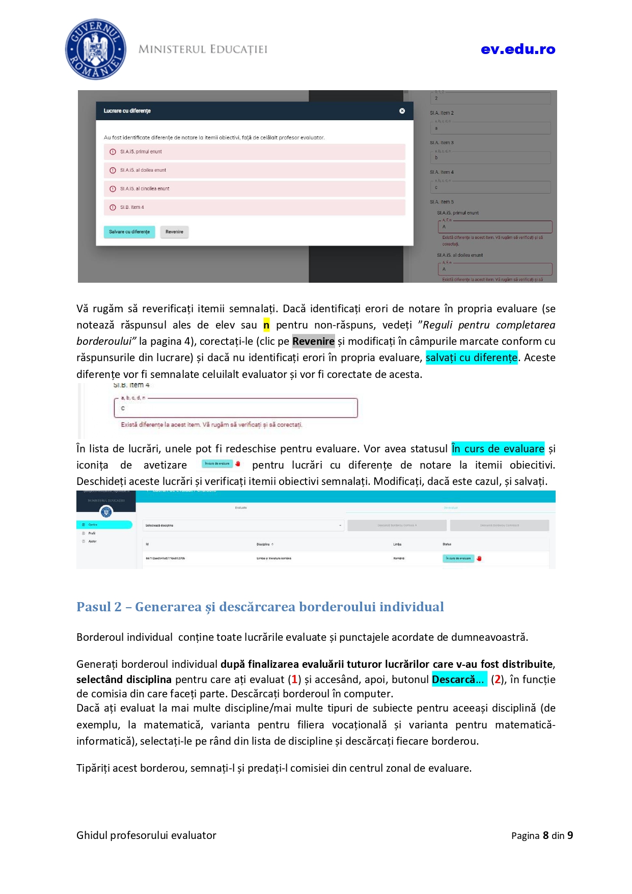 Ghidul profesorului evaluator cuprinde indicațiile pentru autentificarea în platformă, accesarea listei lucrărilor, evaluarea lucrării și generarea borderoului individual, potrivit unui document consultat de Edupedu.ro. Vezi mai jos, în articol, ce se întâmplă în cazul lucrărilor cu diferențe de notare la itemii obiectivi.