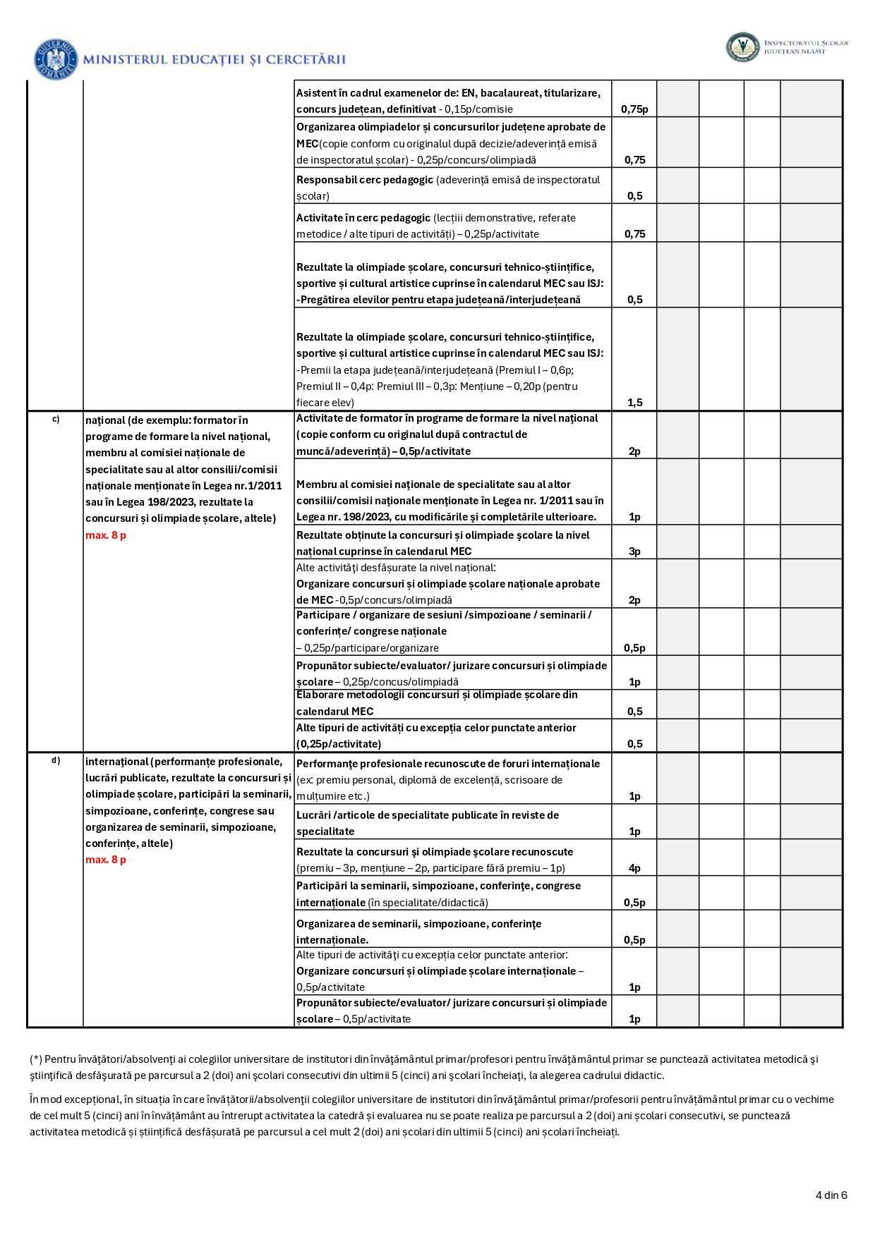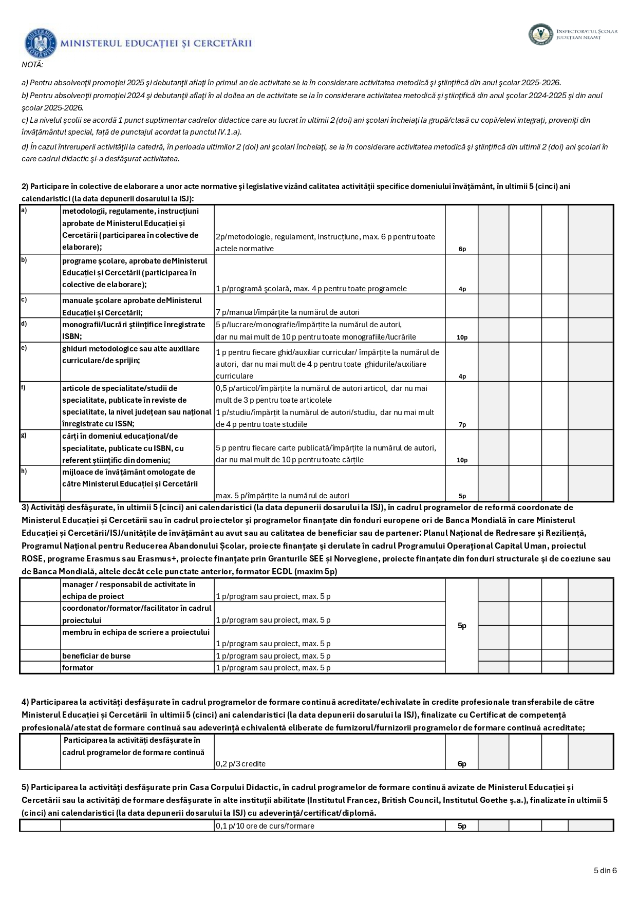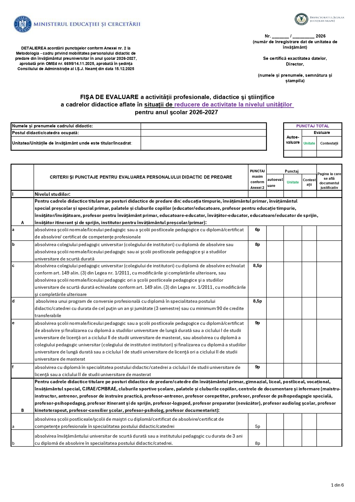 Fişa de evaluare a activităţii profesionale, didactice şi ştiinţifice a cadrelor didactice aflate în situații de reducere de activitate la nivelul unităţilor pentru anul şcolar 2026-2027 – ISJ Neamț: