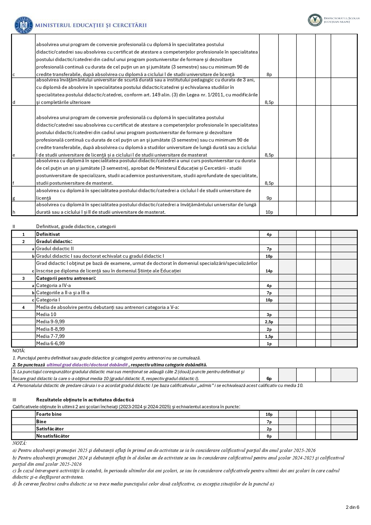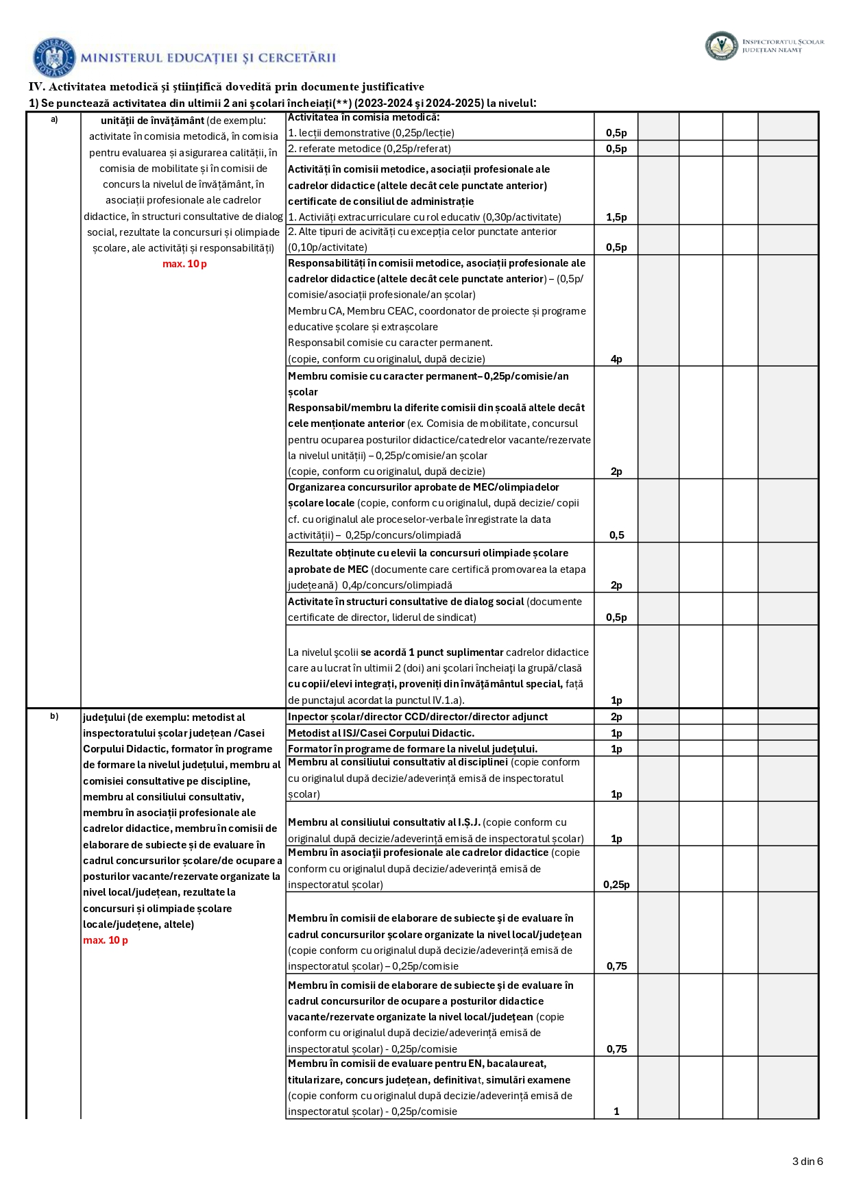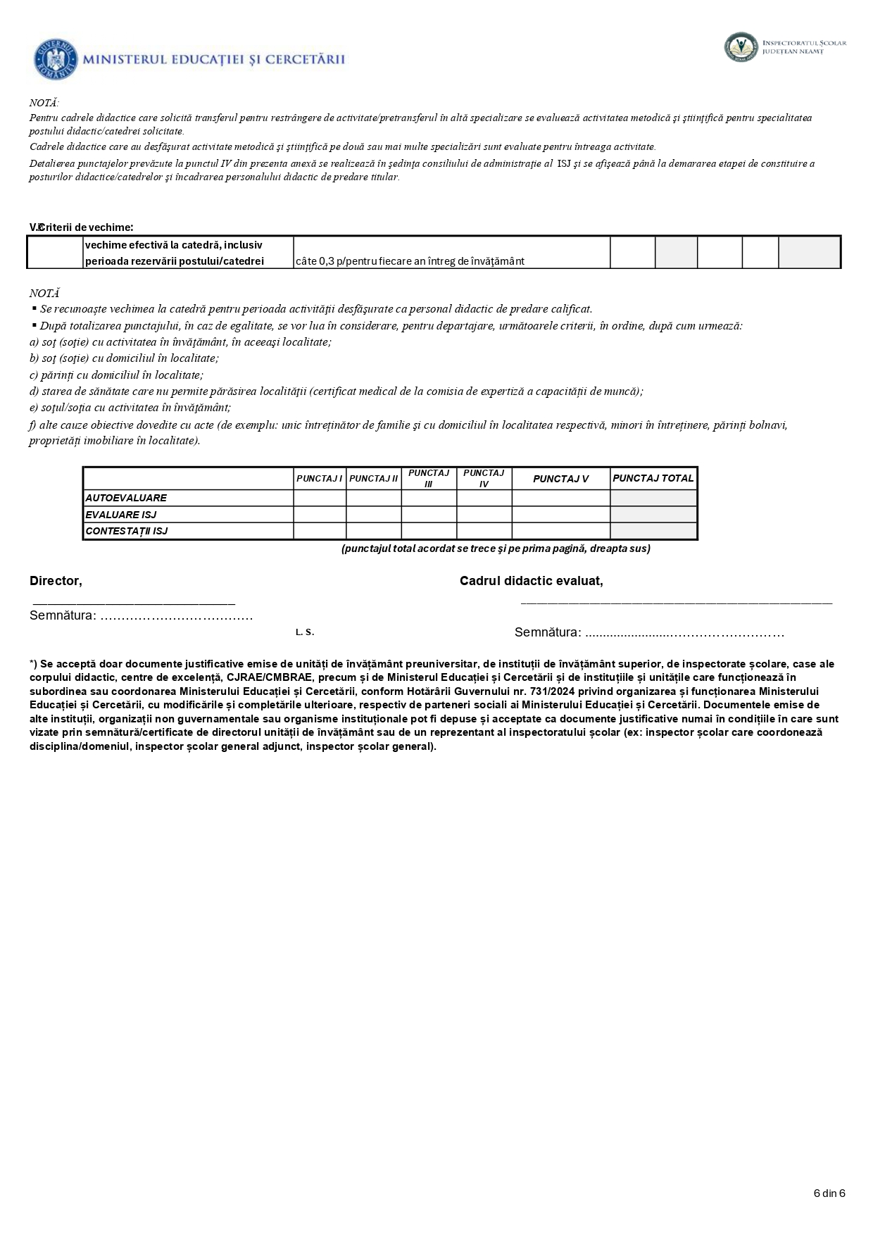 Fişa de evaluare a activităţii profesionale, didactice şi ştiinţifice a cadrelor didactice aflate în situații de reducere de activitate la nivelul unităţilor pentru anul şcolar 2026-2027 – ISJ Neamț: